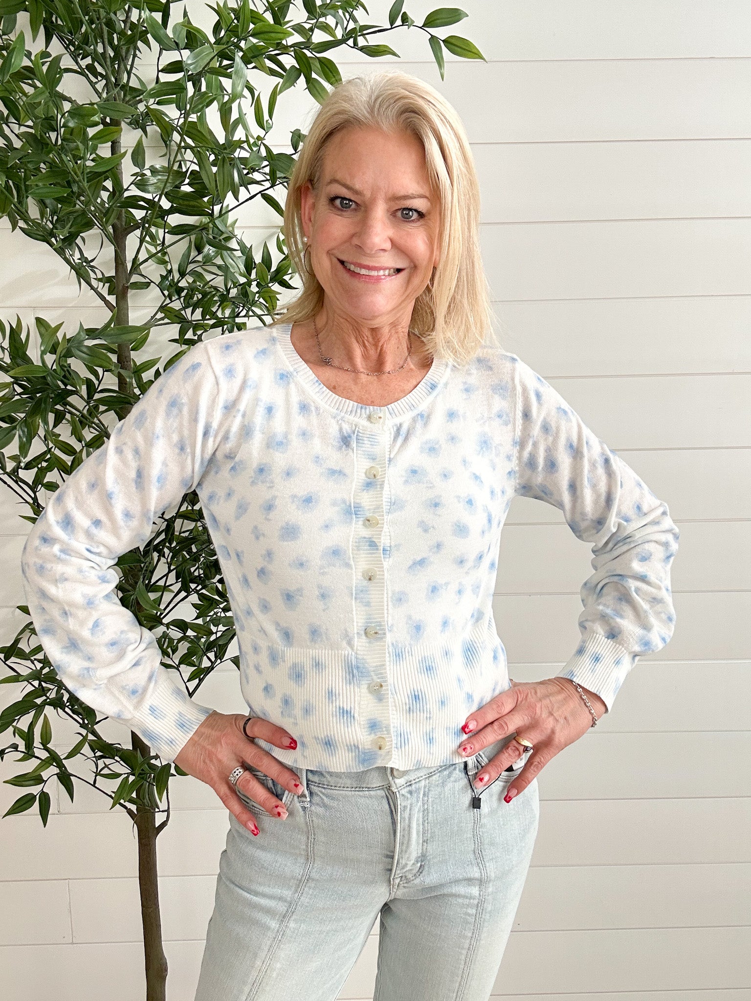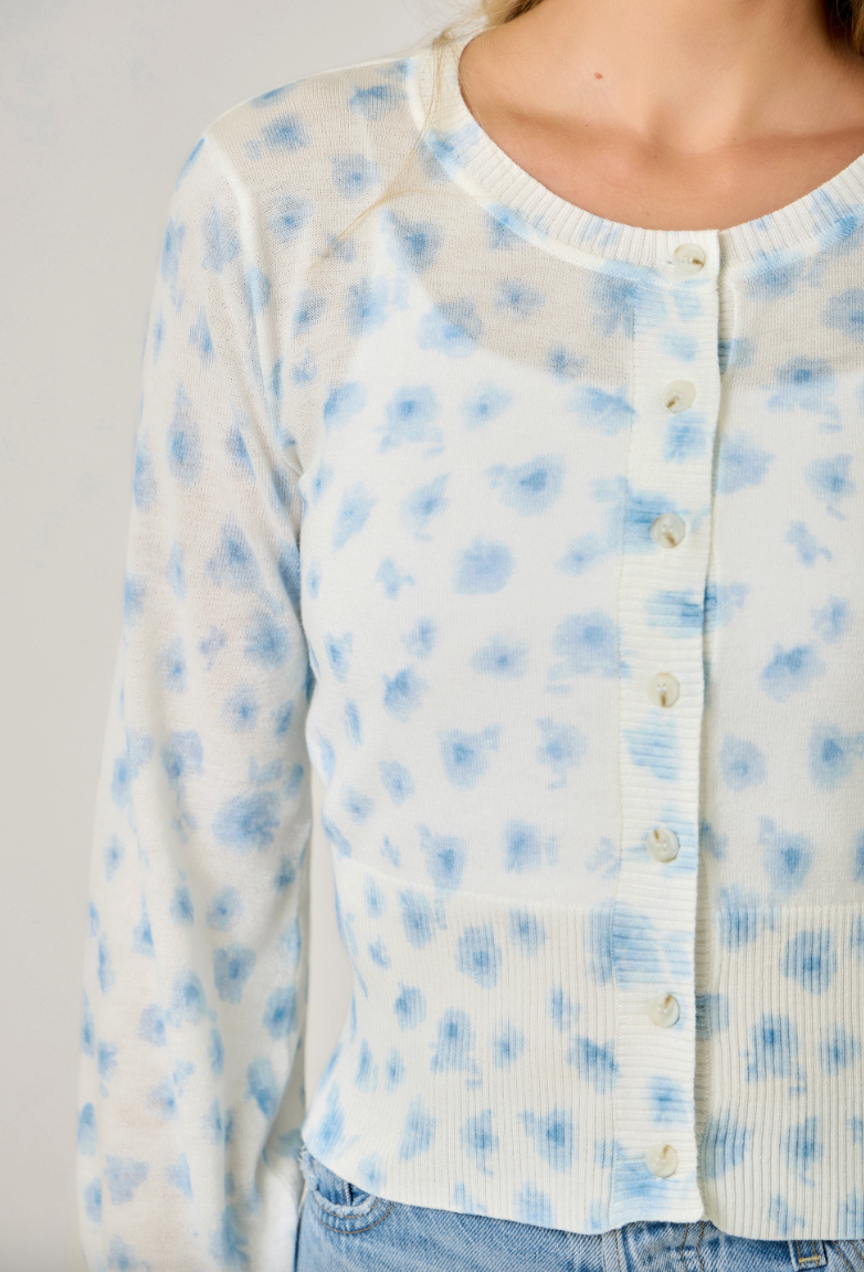 The Watercolor Floral Cardigan is an instant mood-lifter β cozy, feminine, and effortlessly pretty. Designed with small, slightly abstract watercolor florals scattered throughout, this sweater cardigan feels delicate without being fussy. The button-down front and ribbed waist and hem give it a flattering, polished shape, while long bubble sleeves add softness and just the right amount of volume. Itβs the kind of cardigan that makes even a simple outfit feel special.