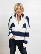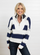 This Wide Stripe Half-Zip Sweater pairs wide, bold stripes with a crisp white panel featuring a sleek quarter zip, creating a fresh, structured look. The meet-and-greet length and long sleeves make it perfect for layering or standing out solo on cooler days.