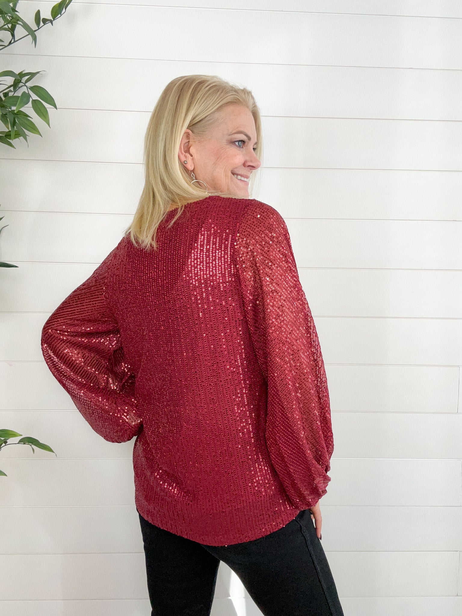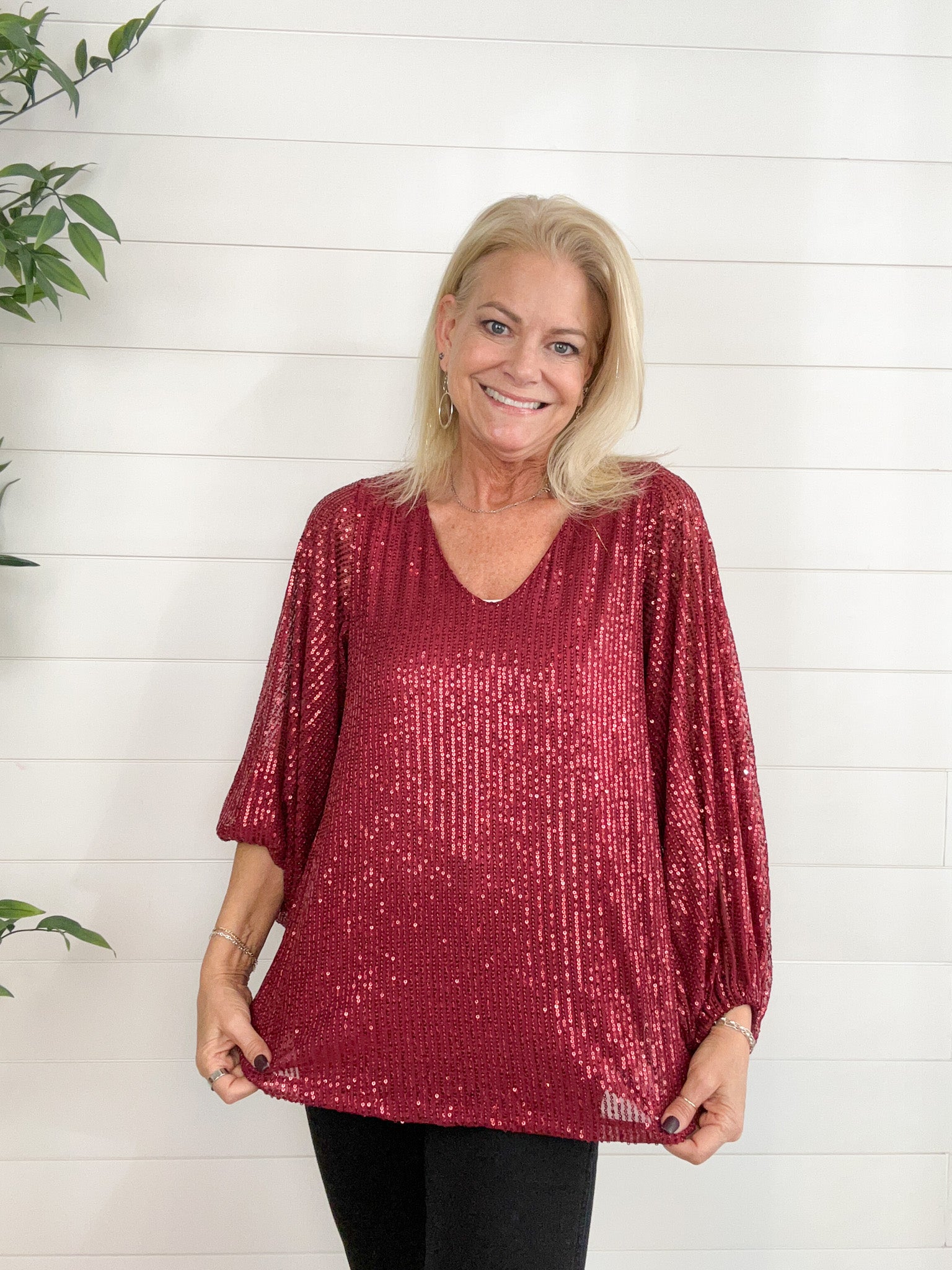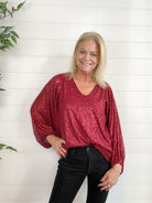 Steal the spotlight in the Allover Sequin Balloon Sleeve Blouse! This glitzy, glamorous top was made for festive nights and unforgettable entrances. With its flattering V-neckline, billowy balloon sleeves, and dazzling allover sequin sparkle, it’s the perfect mix of statement and sophistication.