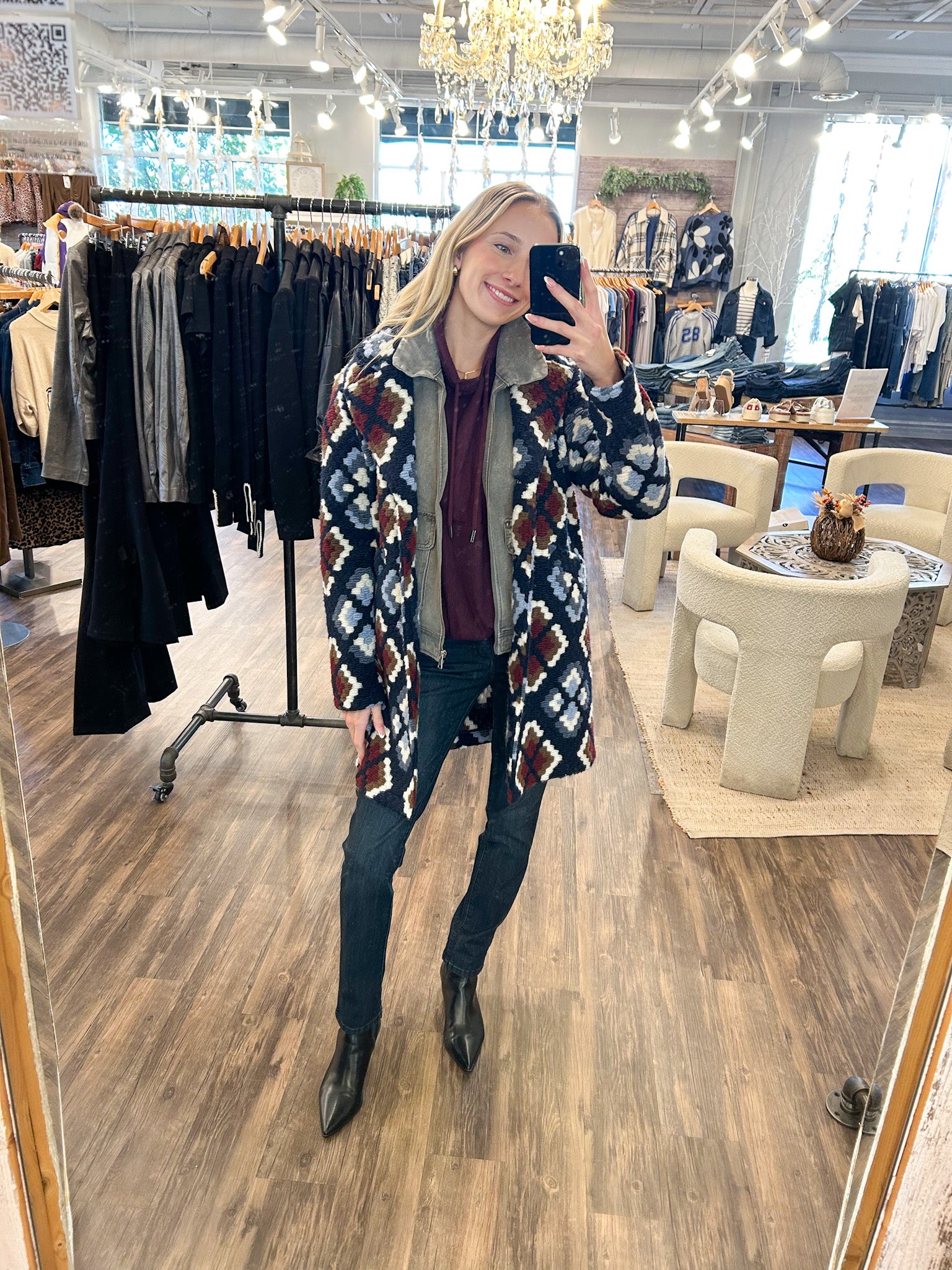 Like a hoodie but with more intentional details, this mixed media knit top is an easy style to reach for when you want to be cozy. It has long banded sleeves, a stand collar with a tie, kangaroo pocket front, and a bubble hem.