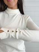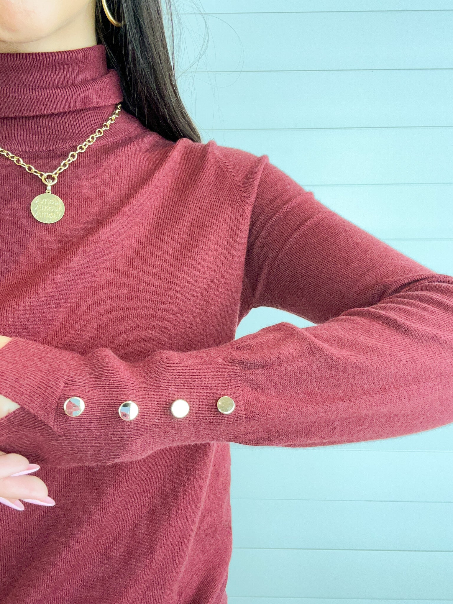 A forever layering piece with a little something extra—this lightweight turtleneck sweater is soft, sleek, and finished with extended cuffs dotted with four buttons for a subtle touch of detail. The easy fit and lightweight knit make it perfect for layering under jackets, cardigans, or wearing solo for a clean, polished look.