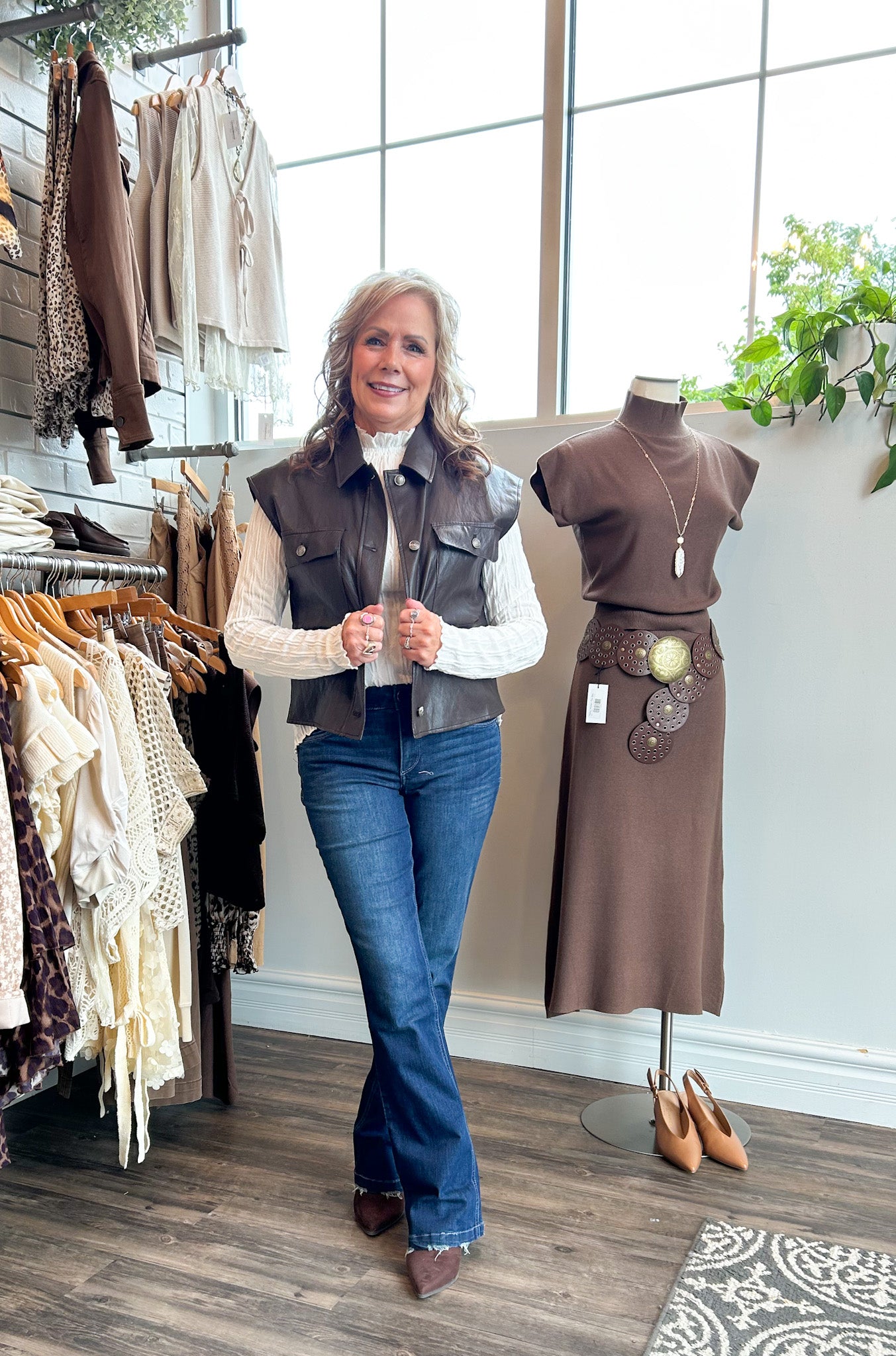 Give your outfit that instant edge with this Faux Leather Embossed Button Vest. The textured finish and classic collar bring timeless cool, while the two flap-and-button breast pockets add a hint of utility charm. Designed with no stretch for a structured fit, this piece layers beautifully over everything from crisp shirts to casual tees—making it a style staple you’ll reach for year-round.