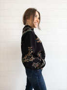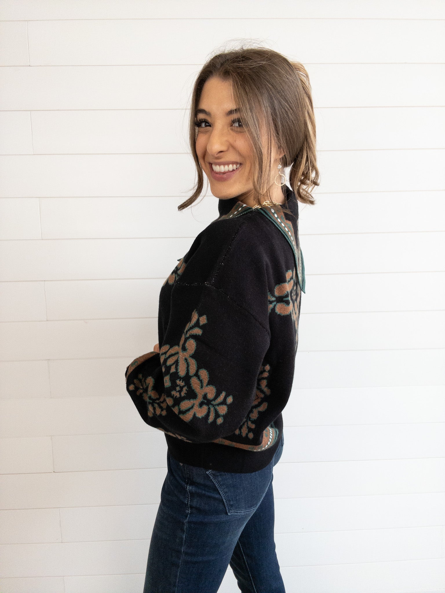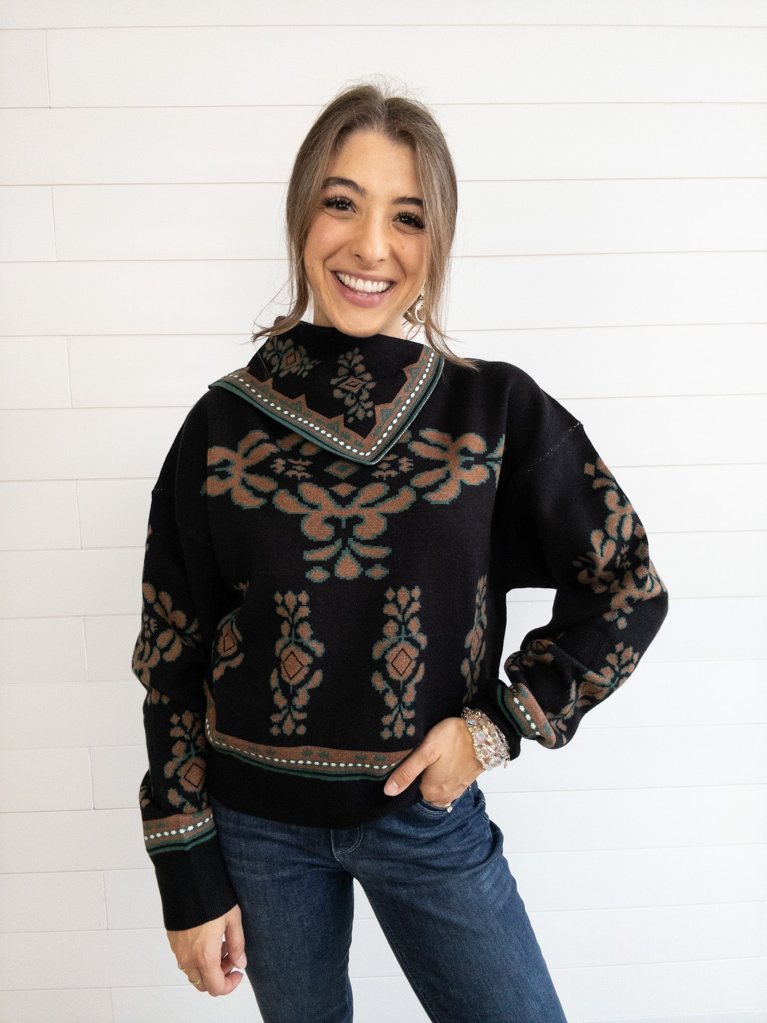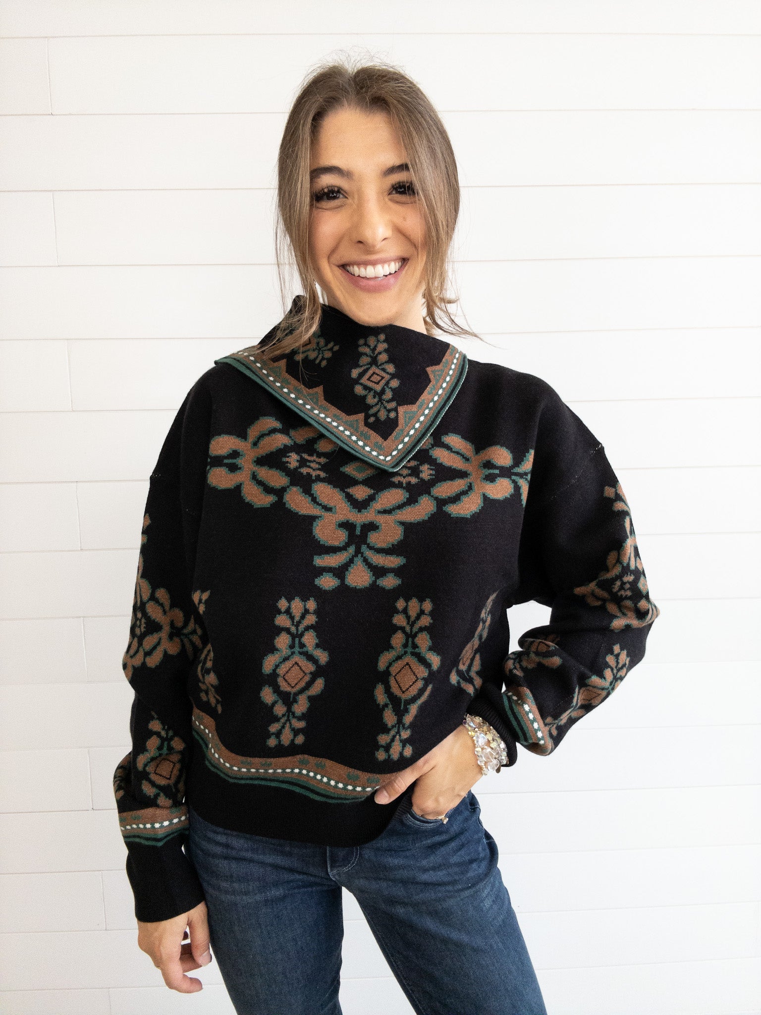 This standout sweater turns classic cozy into conversation-starting chic. A filigree border print traces the hem and sweeps upward along a dramatic asymmetrical collar, which folds into a sharp diamond shape at the neckline. The soft, midweight knit keeps it comfy, while the silhouette brings all the flair.