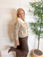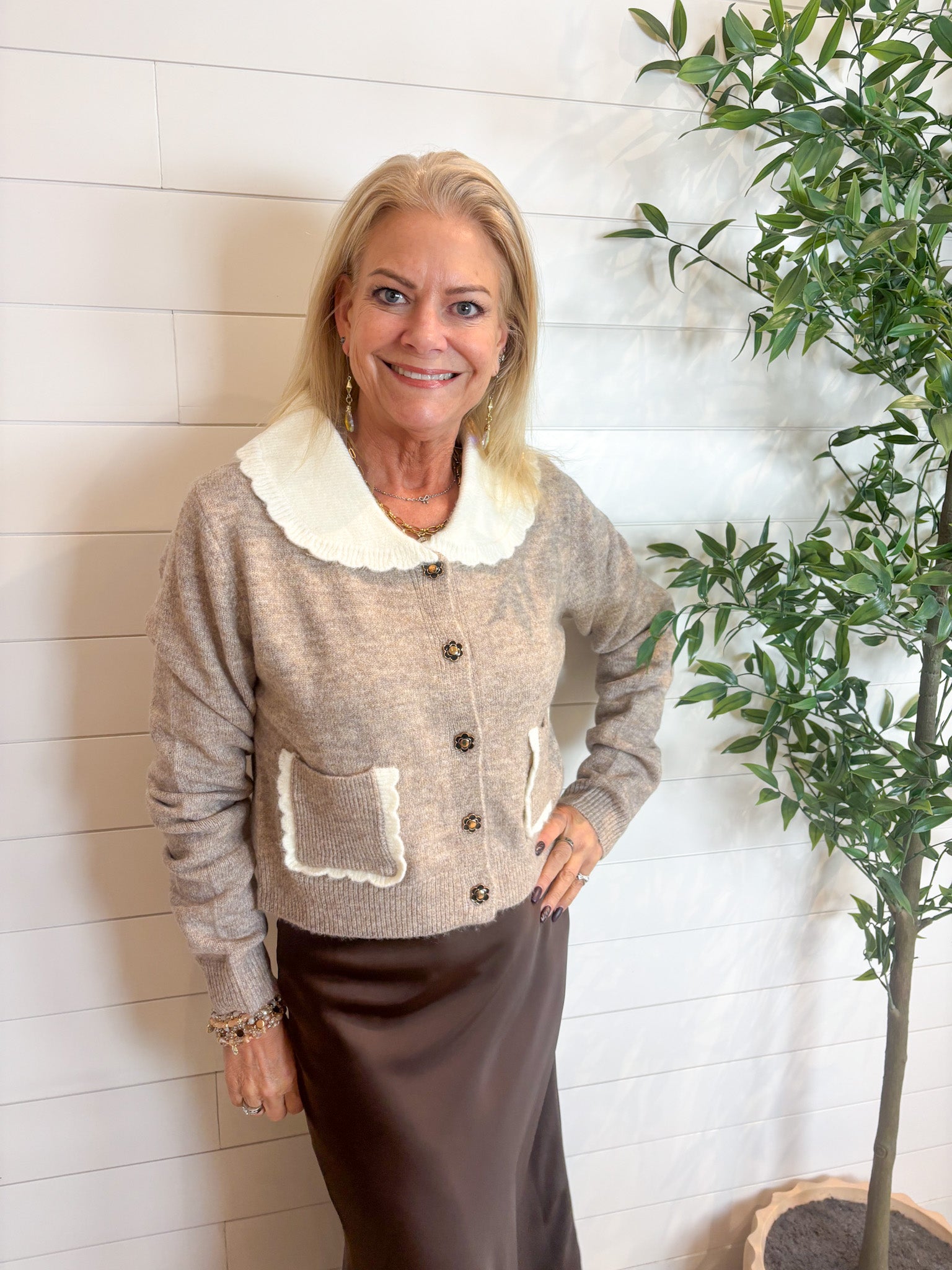 The Flower Button Peter Pan Collar Sweater is vintage charm wrapped in cozy knit perfection. This darling cardigan features a contrast Peter Pan collar and scalloped patch pockets for a playful, feminine finish. Shiny black enamel flower buttons framed in gold add a touch of whimsy and polish—like jewelry built right in!