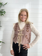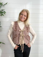 Our Flower Crochet Front Tie Sweater Vest is a sweet mix of vintage charm and modern-day ease. Crafted in a soft, wool-blend knit with delicate tonal floral embroidery, it’s the kind of piece that makes any outfit feel special. The dual front ties and cropped silhouette add a playful, boho twist that layers beautifully over dresses, blouses, or tees.