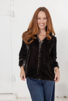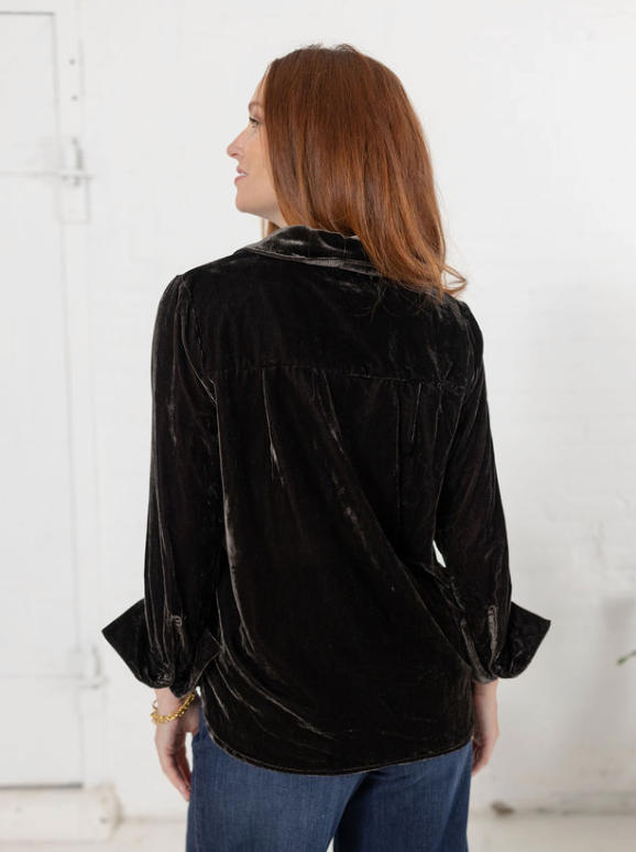Shiny, chic, and sure to go with everything in your wardrobe. This velvet woven shirt features long sleeves with French cuffs, a collared neck, and a button front.