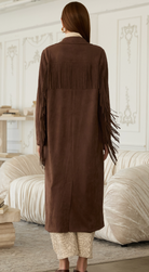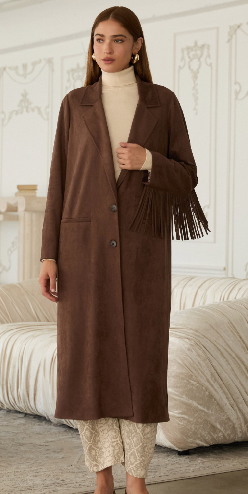 Turn heads this season with the Fringe Trim Faux Suede Coat—a statement layer that blends western flair with polished tailoring. Crafted in soft faux suede with a touch of stretch, this coat features a classic blazer-inspired silhouette with a notch lapel, button-front closure, and sleek top-entry pockets. The real star? Swingy fringe detailing that cascades down the arms and across the back, bringing plenty of movement (and compliments) wherever you go. Fully lined for comfort and warmth, it’s the perfect mix of fun and functional.