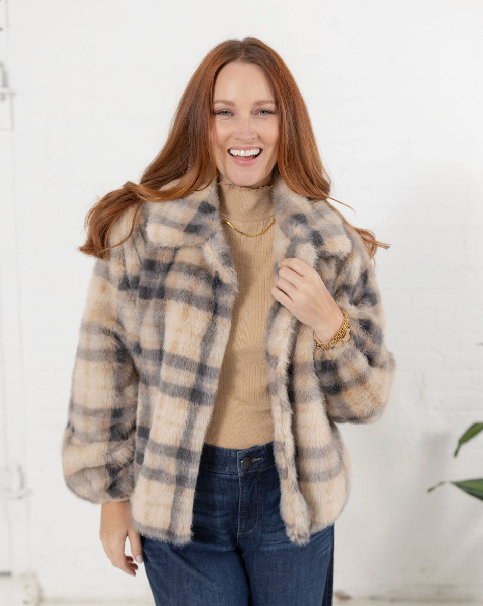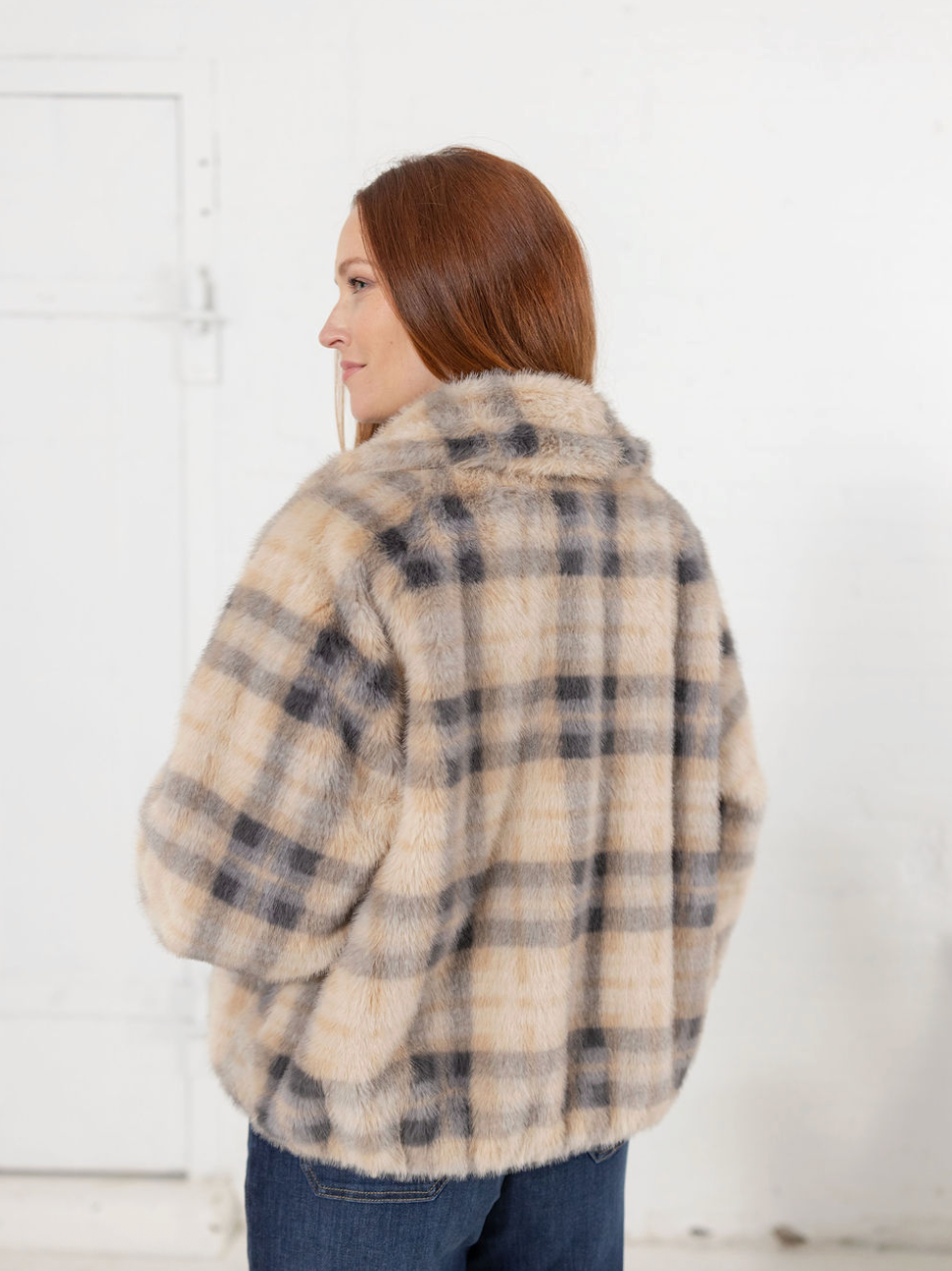 Get ultimate comfort in this soft faux fur bomber jacket. With long blouson sleeves, a button front, side pockets, and a plaid print, it’s cozy, on-trend, and endlessly versatile.