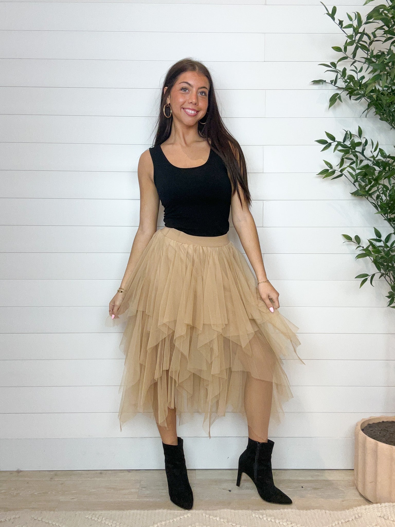 The Irregular Hem Tiered Mesh Skirt is made for movement. With its layered mesh design and asymmetrical hem, it brings flowy drama to every step. The outer mesh falls to a chic midi length, while the soft lining hits just above the knee for comfortable coverage. Light, airy, and oh-so romantic, this skirt is the perfect way to dress up your everyday or add a dreamy touch to special occasions.