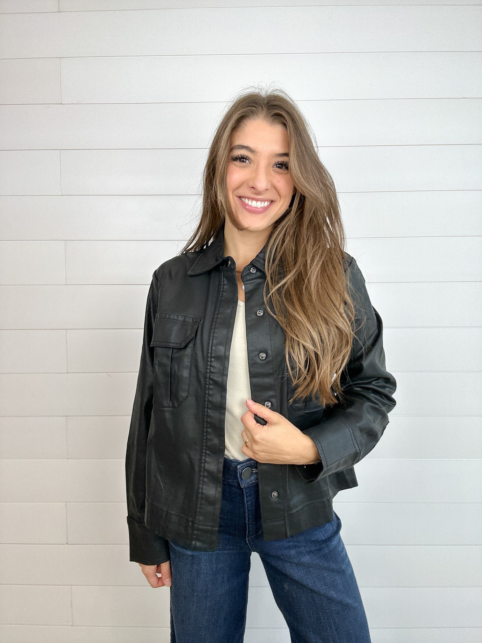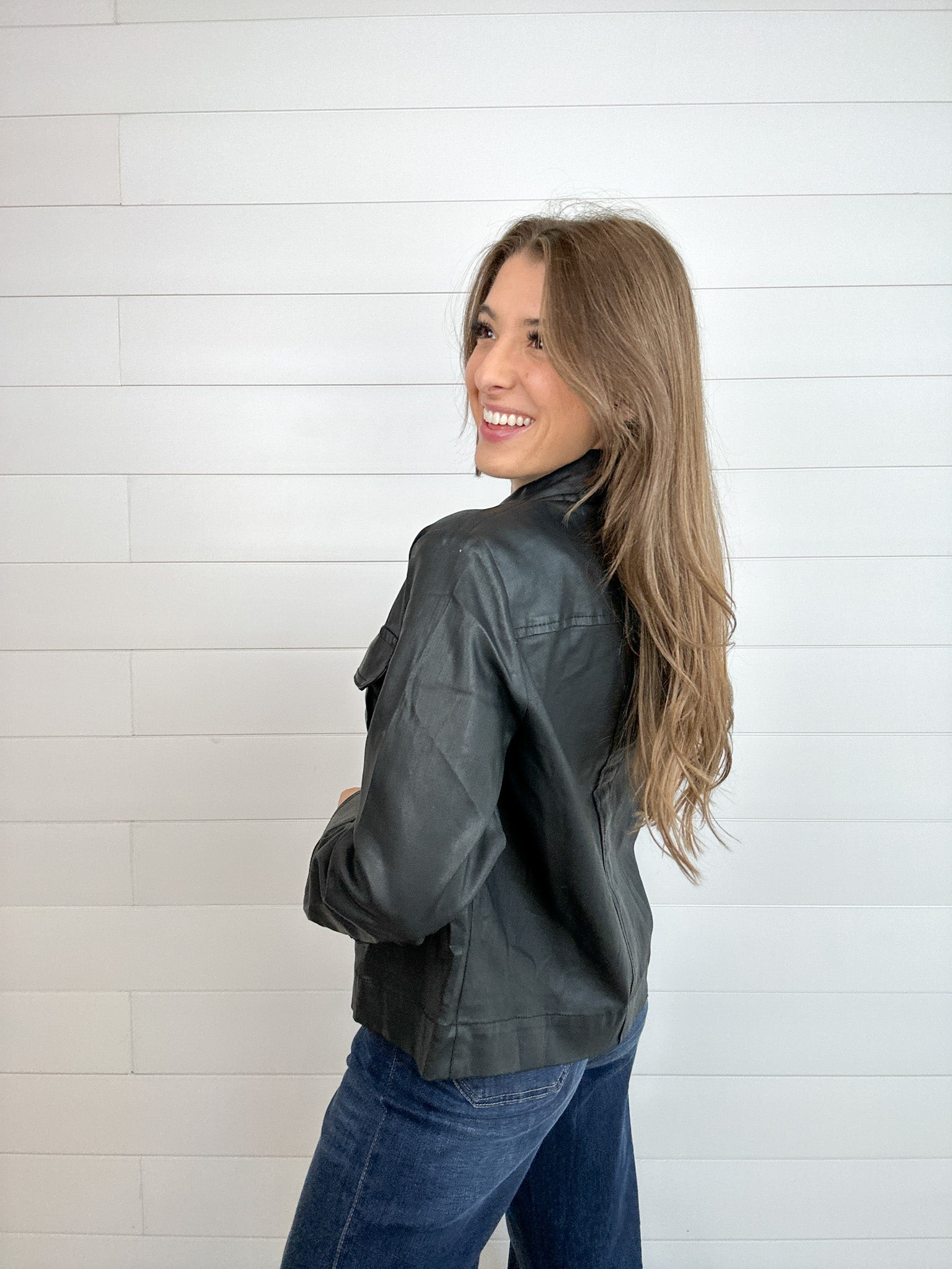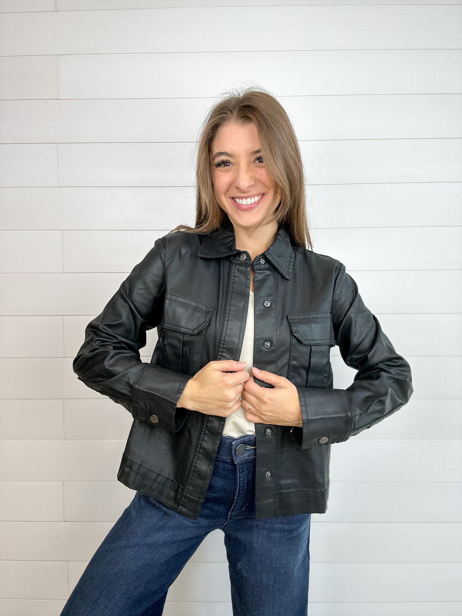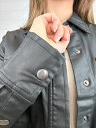 Edgy meets polished in this versatile coated jacket. Crafted with a soft, stretch-infused blend, it’s finished with a sleek coating that gives the illusion of faux leather—without the stiffness. Snap-front closures and patch pockets add a utilitarian touch, while unbuttonable sleeves make rolling them up a breeze for a more casual vibe.