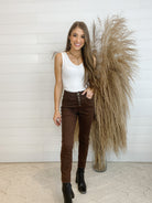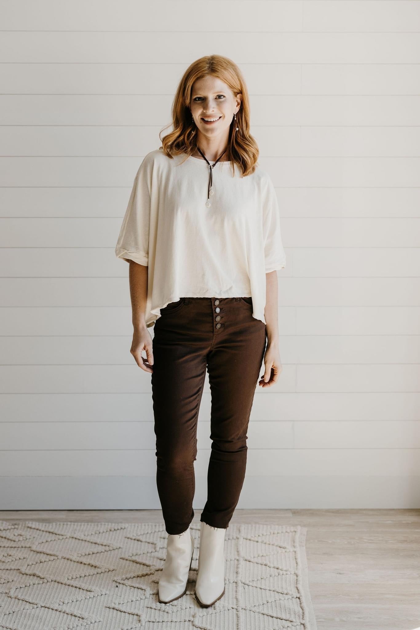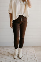 The perfect brown wash button fly? Say no more! Made with our famous Mac and Me stretchy fabric, you'll forget you're wearing denim. Pair these back to a neutral top for a classic look, or venture out with a complimentary color for a more bold fit!