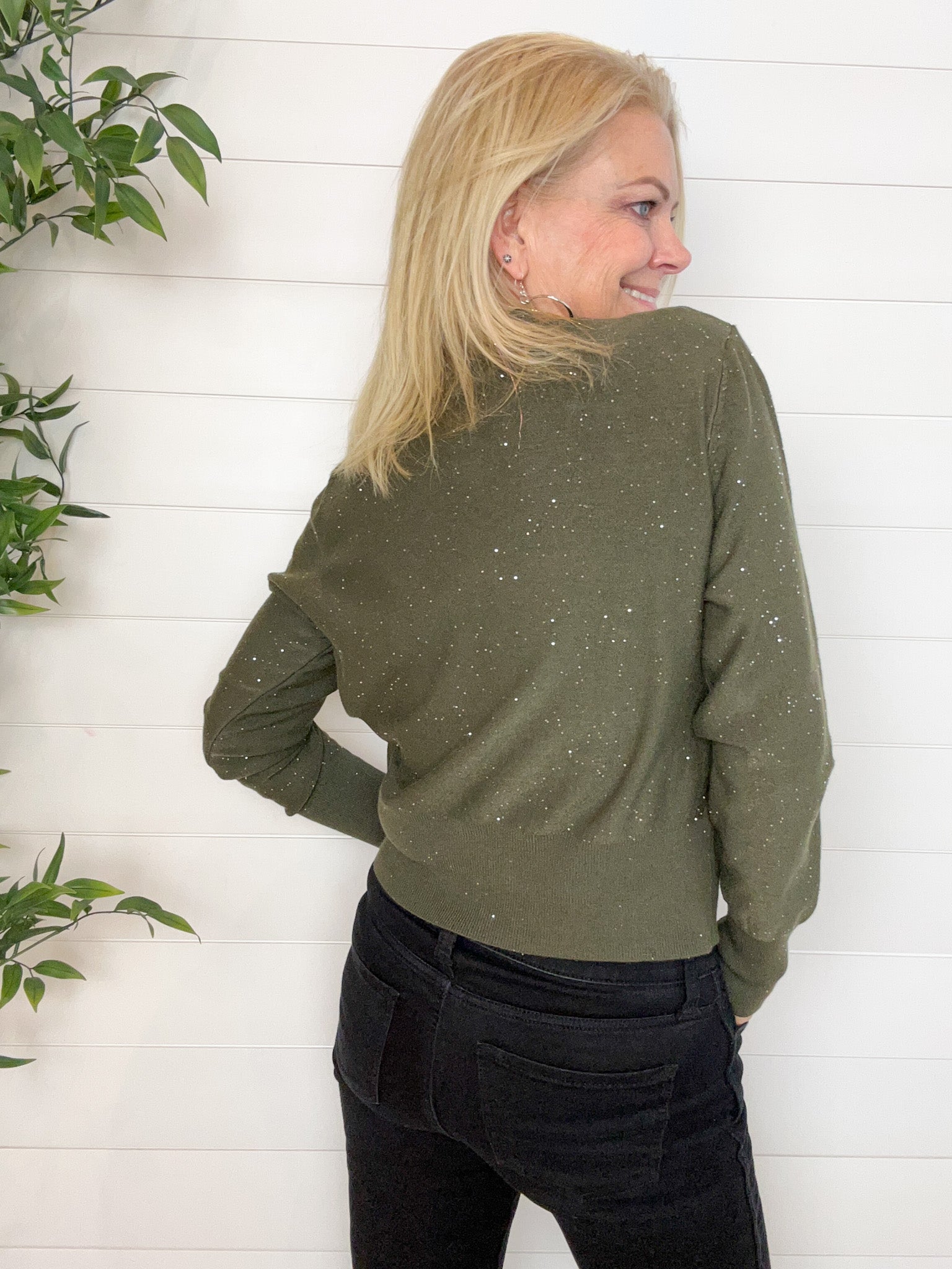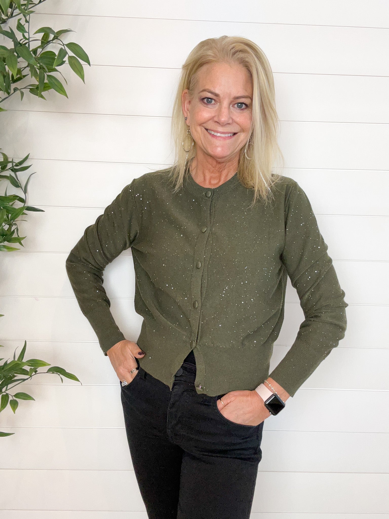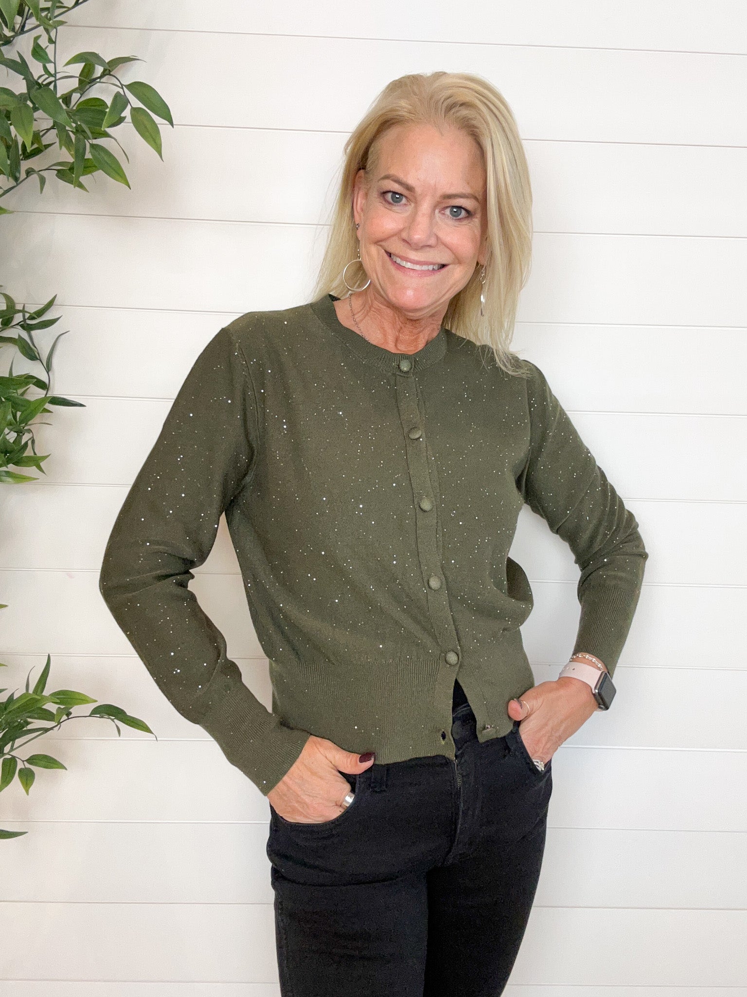 The Made in Italy Micro Sequin Classic Cardigan adds a touch of everyday glamour to your wardrobe. Covered in teeny silver micro sequins that shimmer softly in the light, this timeless cardigan layers beautifully over camis, blouses, or dresses. Its meet-and-greet length and matching cloth-covered buttons give it a refined finish that’s both classic and eye-catching.