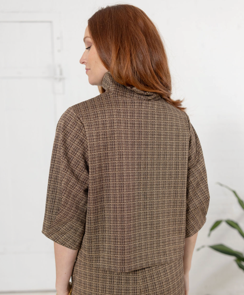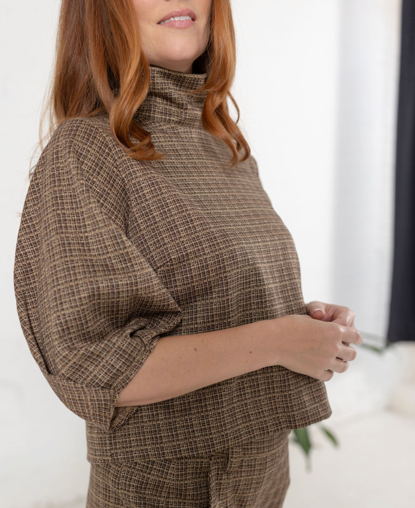 Soft, comfortable, and made for any type of day, this cropped knit top is sure to become a favorite in your rotation. It has elbow pleated sleeves, a mock neck, seaming details, and a shiny plaid design.