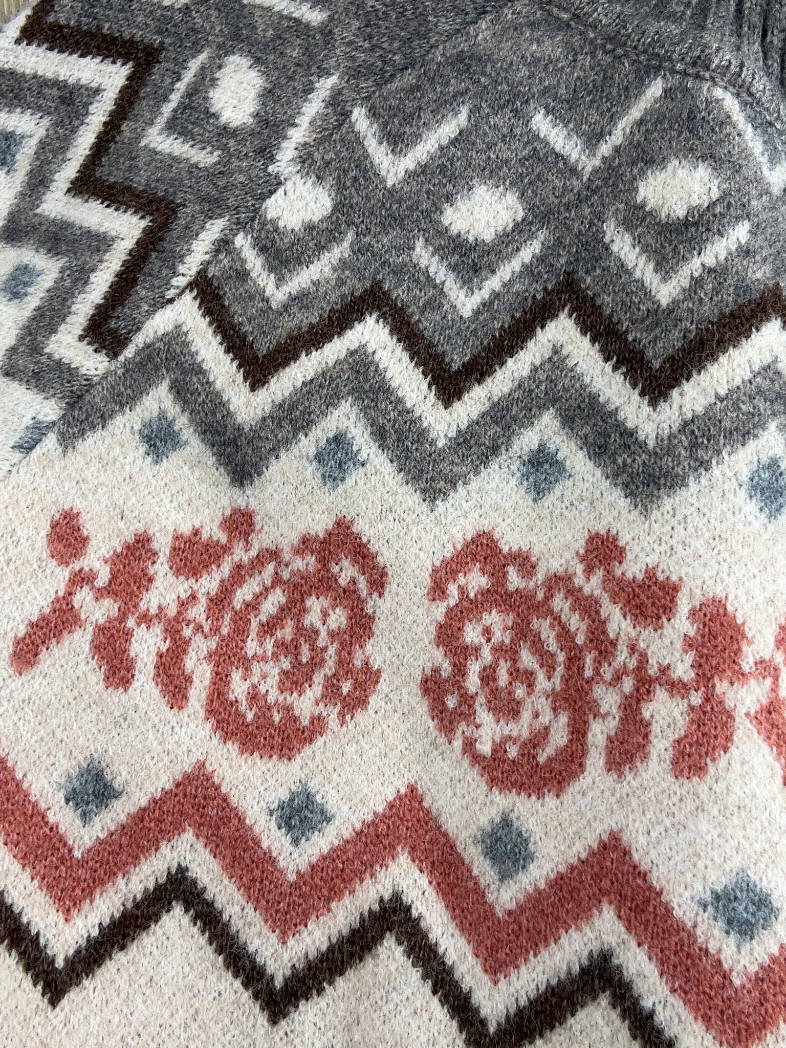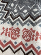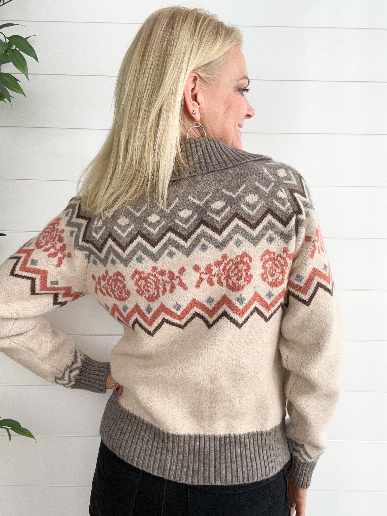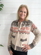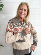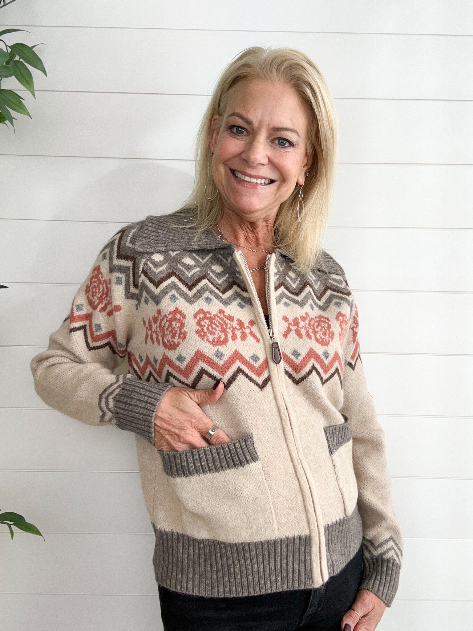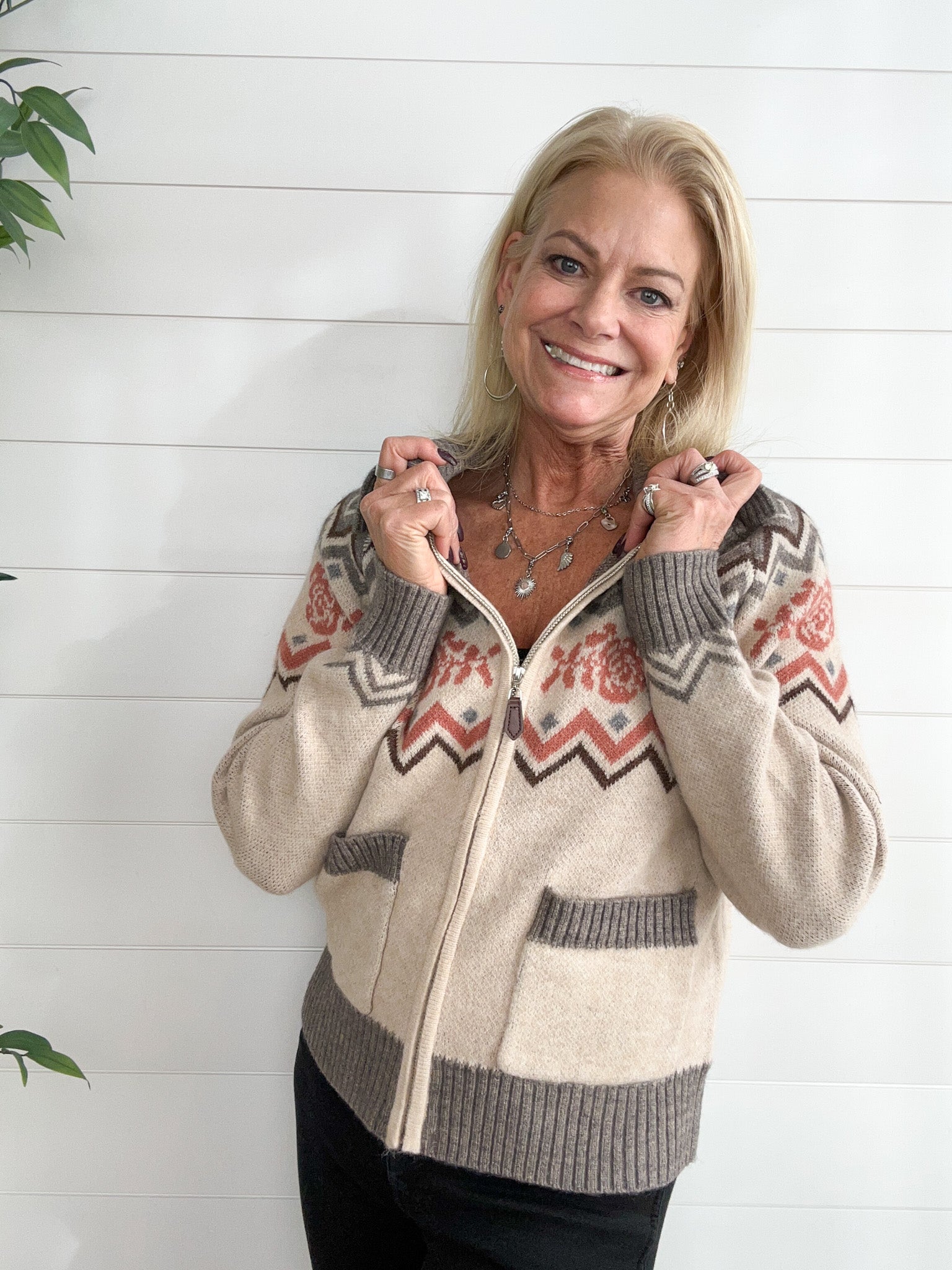 Our Retro Floral Knit Zip-Up Cardigan brings all the vintage charm with none of the fuss. Featuring a warm-toned floral and zigzag jacquard pattern, this soft brushed knit cardigan is equal parts playful and practical. A wide ribbed collar and front zip closure give it that sporty-meets-feminine feel, while the cozy ribbed trim and front patch pockets make it an instant cold-weather favorite.