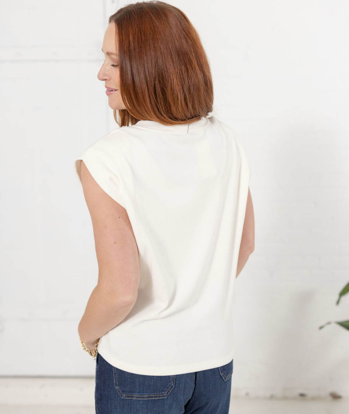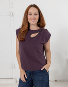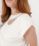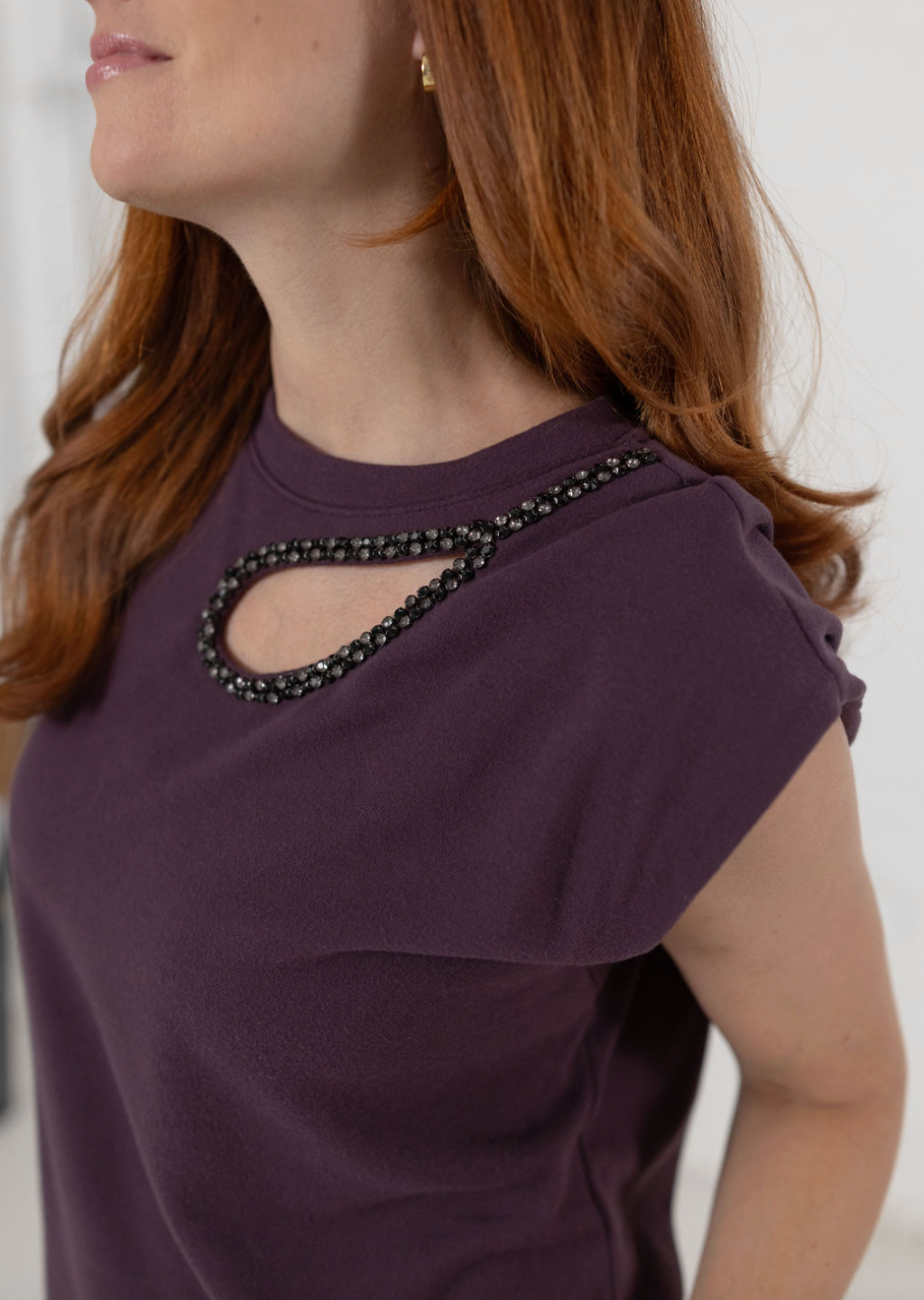 Add a touch of festive flair to your ensemble with this knit top. It features extended cap sleeves, a crew neck, and a subtle rhinestone cut out that ties the entire look together.