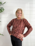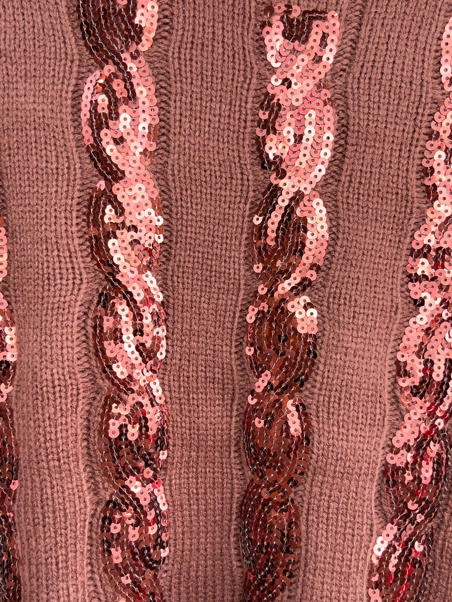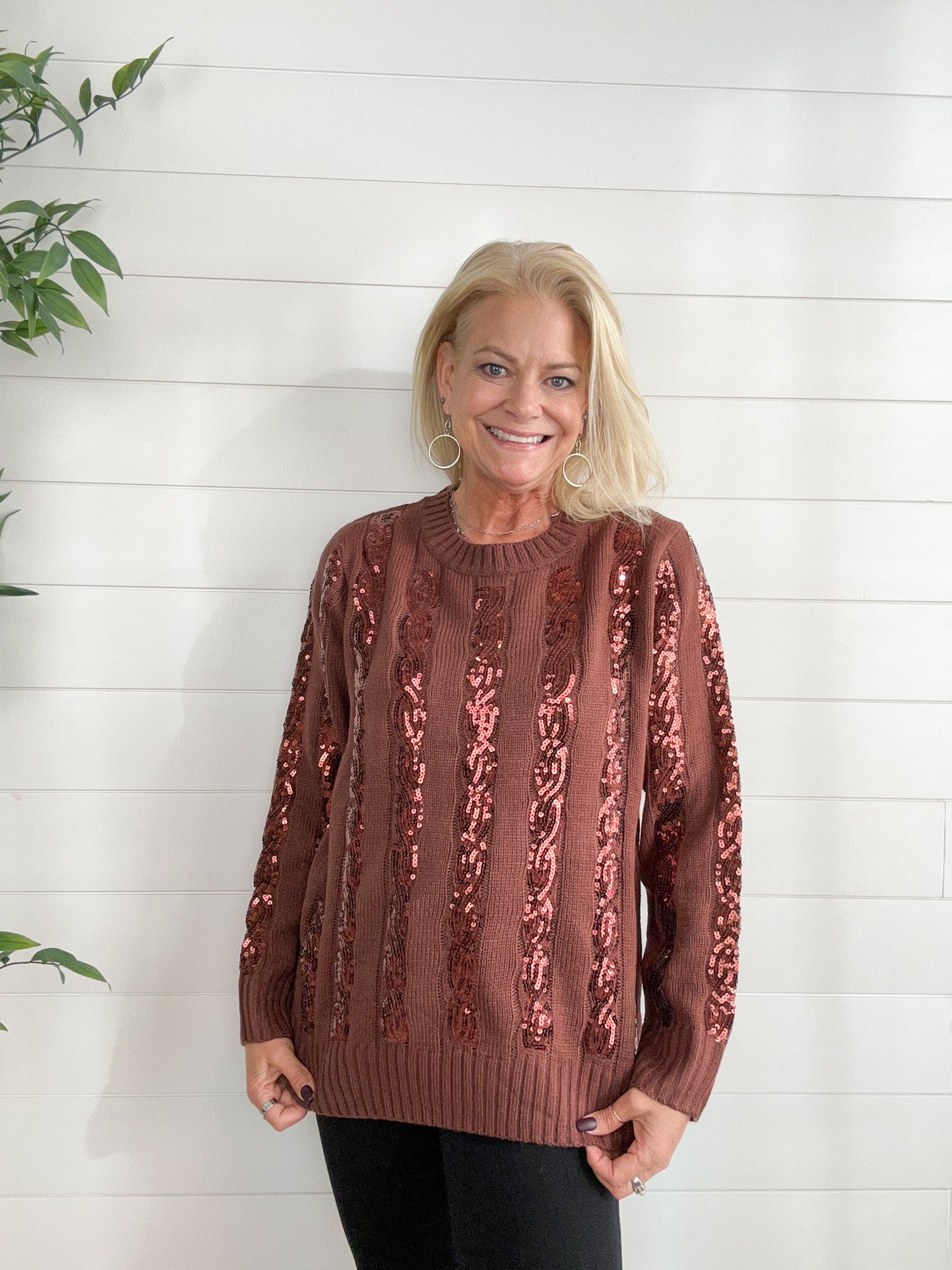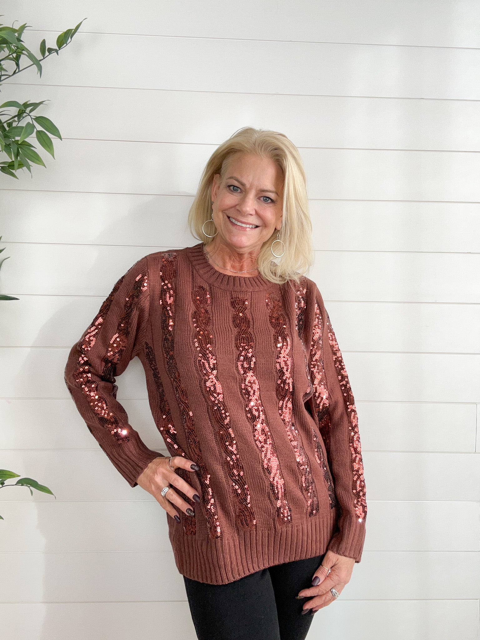 The Sequin Detail Cable Knit Sweater brings classic charm with a hint of glimmer. Crafted with timeless cable knit texture and delicate sequin accents, it’s the perfect mix of cozy and glam. A soft ribbed neckline and hem complete the look, keeping it polished yet effortlessly wearable.