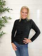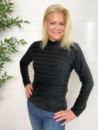 This stretchy staple knit top is a go-to for office days, brunch with your friends, or date night. It has long sleeves, a mock neck, asymmetrical side ruching, and a shirttail hem.