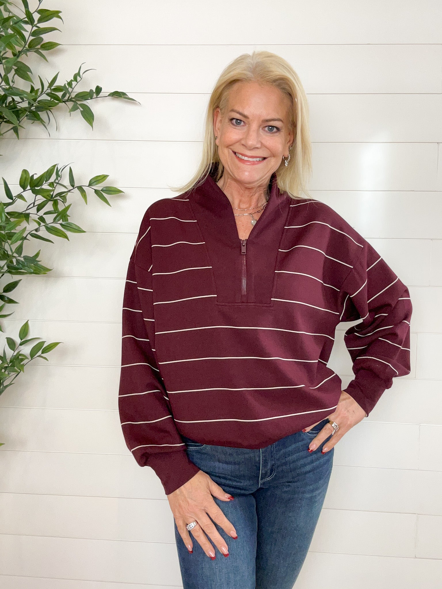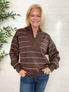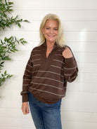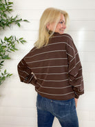 The Stripe Scuba Knit Tulip Collar Top blends sporty ease with a touch of polish. Crafted from a soft, bouncy scuba knit, it features a flattering tulip collar with a functional quarter zip, giving you endless ways to style your neckline. The striped design adds a casual-cool vibe, while the generous fit keeps things comfy and relaxed.