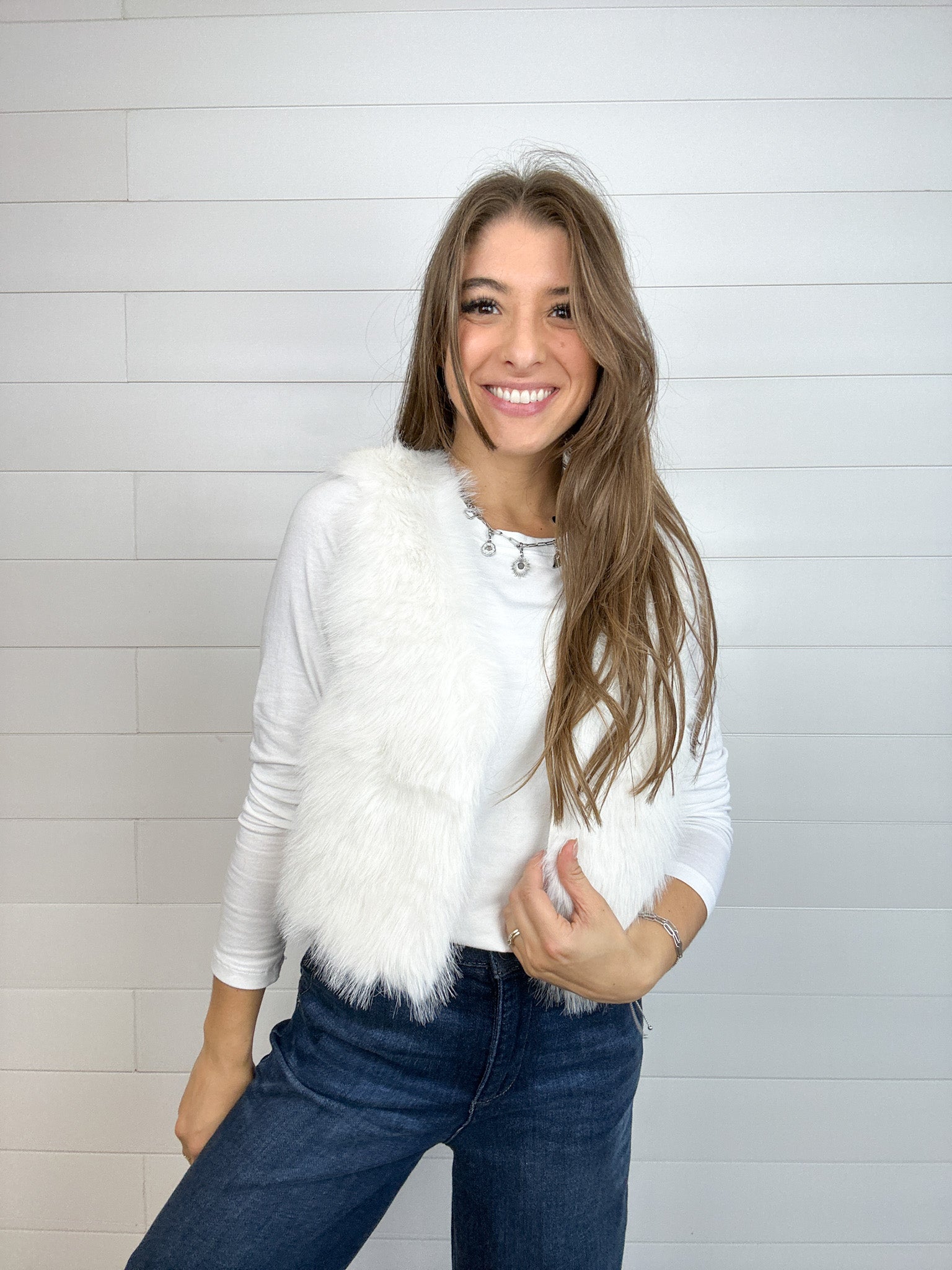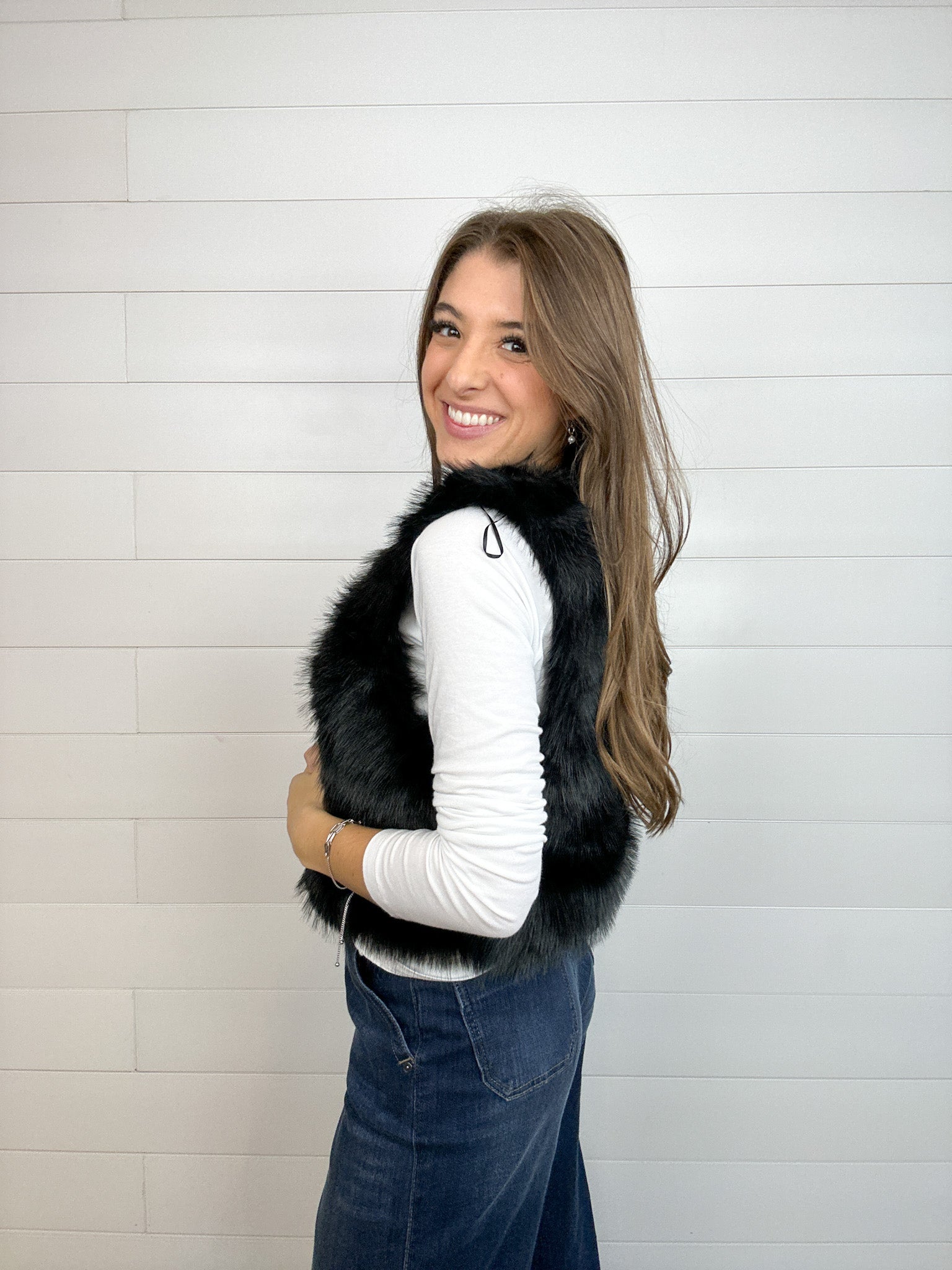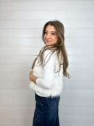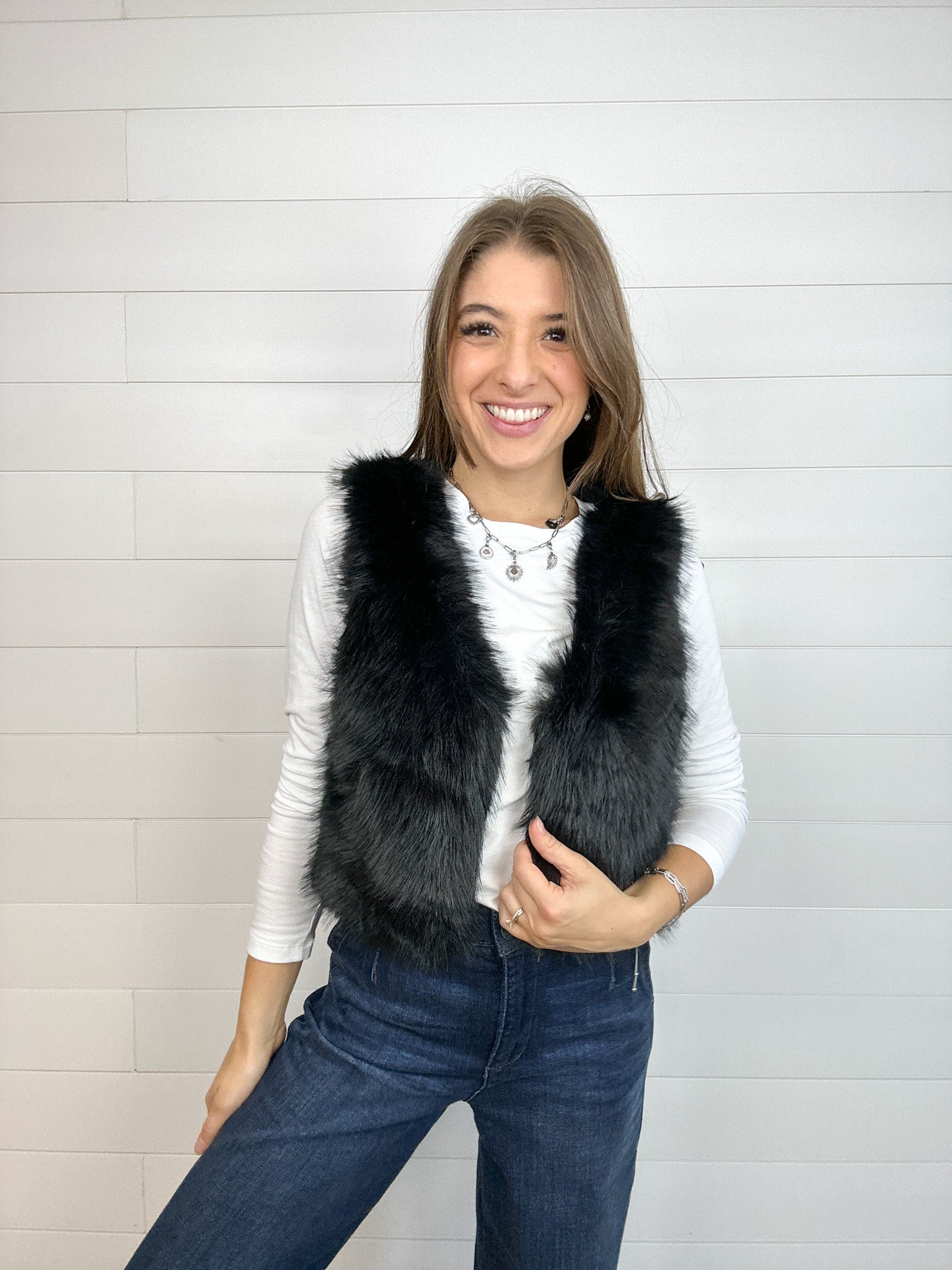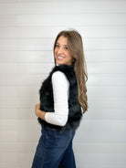 Channel retro glam with this fluffy cropped vest — the perfect layering piece for when your outfit needs a little extra groove. Designed with a deep V-neckline and soft lining, it slips on effortlessly without closures for that carefree, vintage-inspired feel.