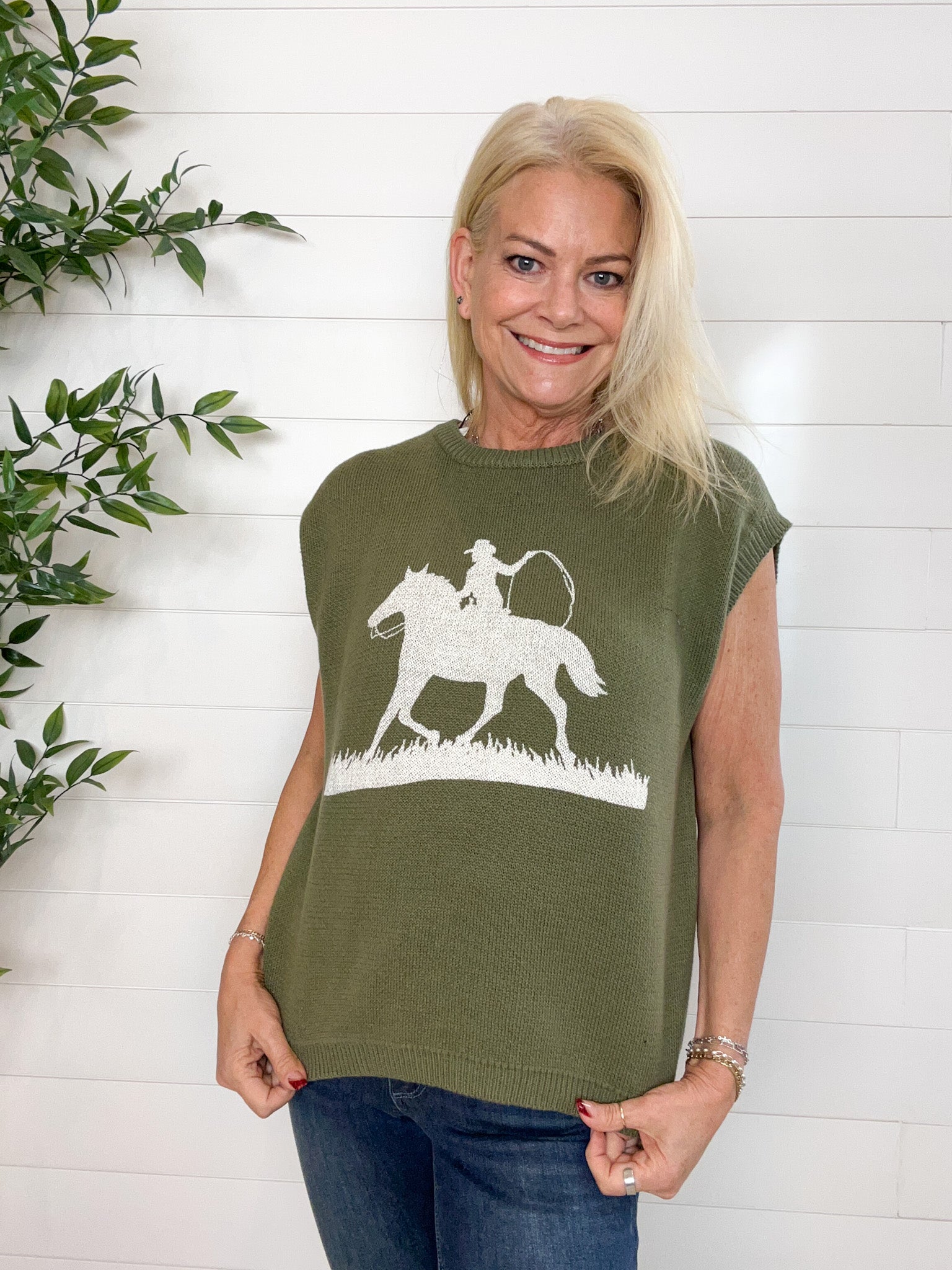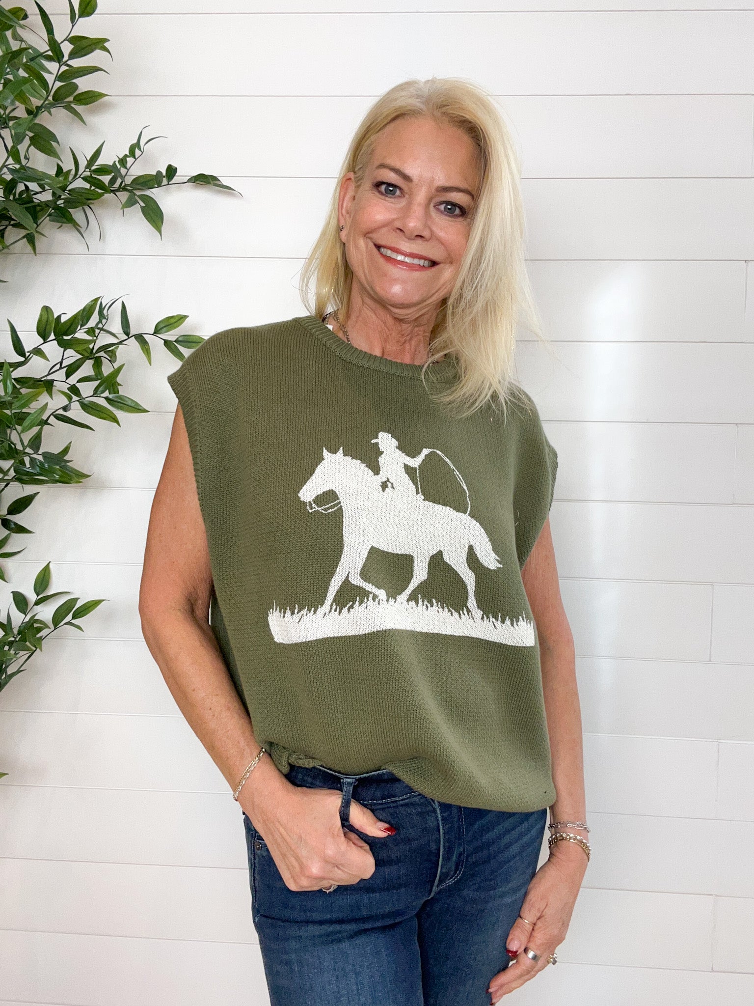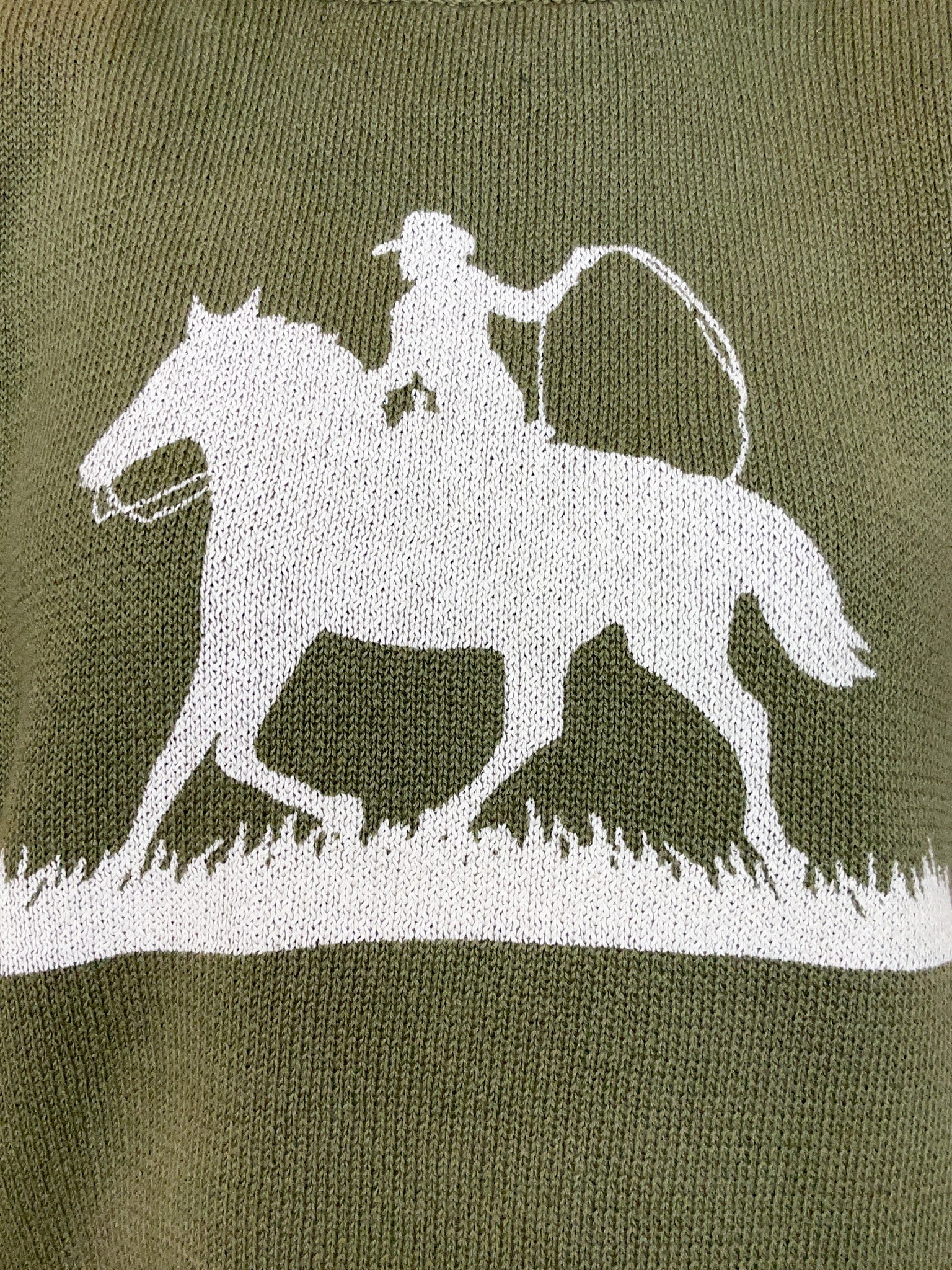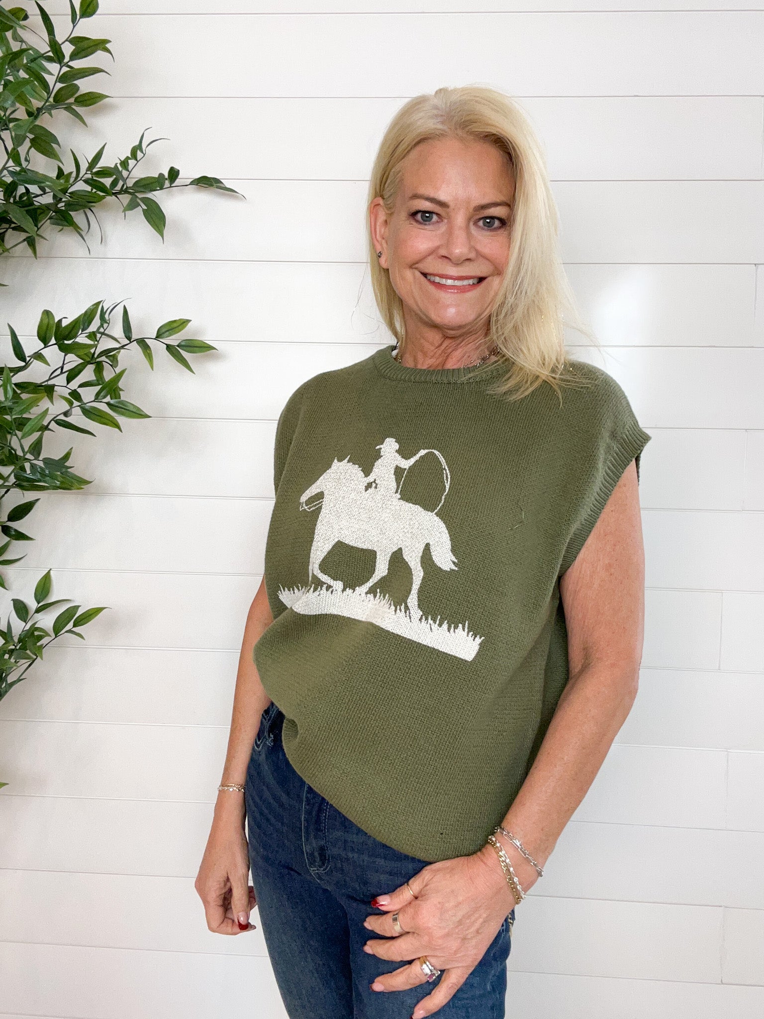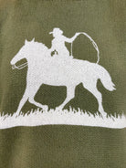 The Wranglin’ Cowgirl Silhouette Sweater brings a playful nod to western charm with a bold cowgirl-on-horse design, lasso in hand and ready for adventure. Made from 100% cotton, it’s soft, breathable, and perfect for everyday wear. The cap sleeves and meet-and-greet length give it a fresh, modern shape that pairs easily with your favorite jeans or skirts—making it a fun statement piece for any season.