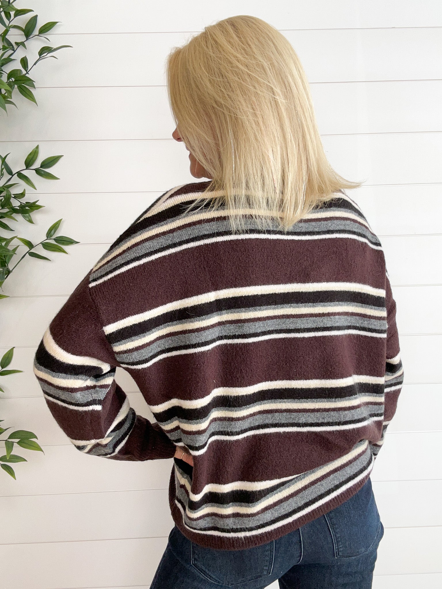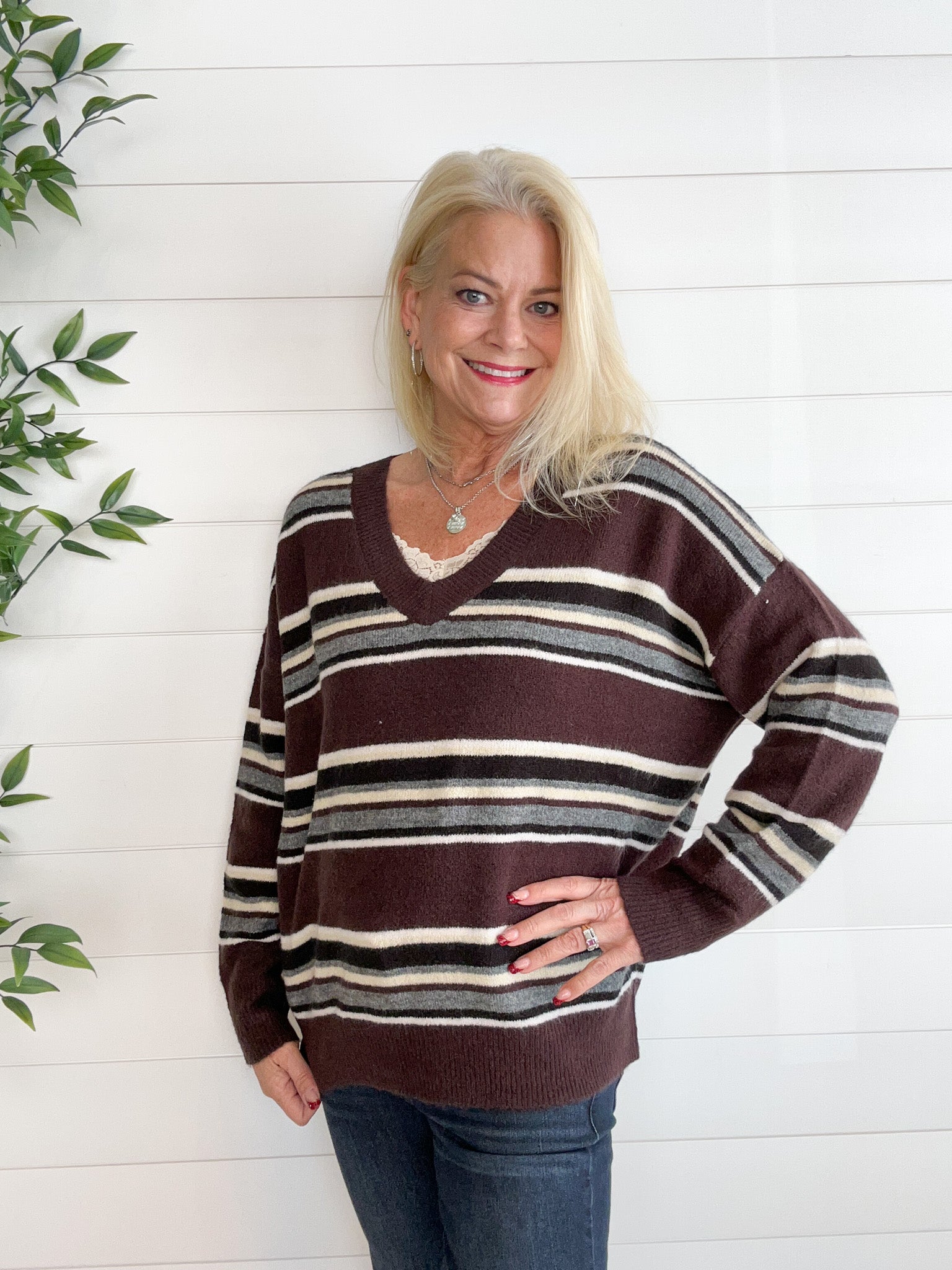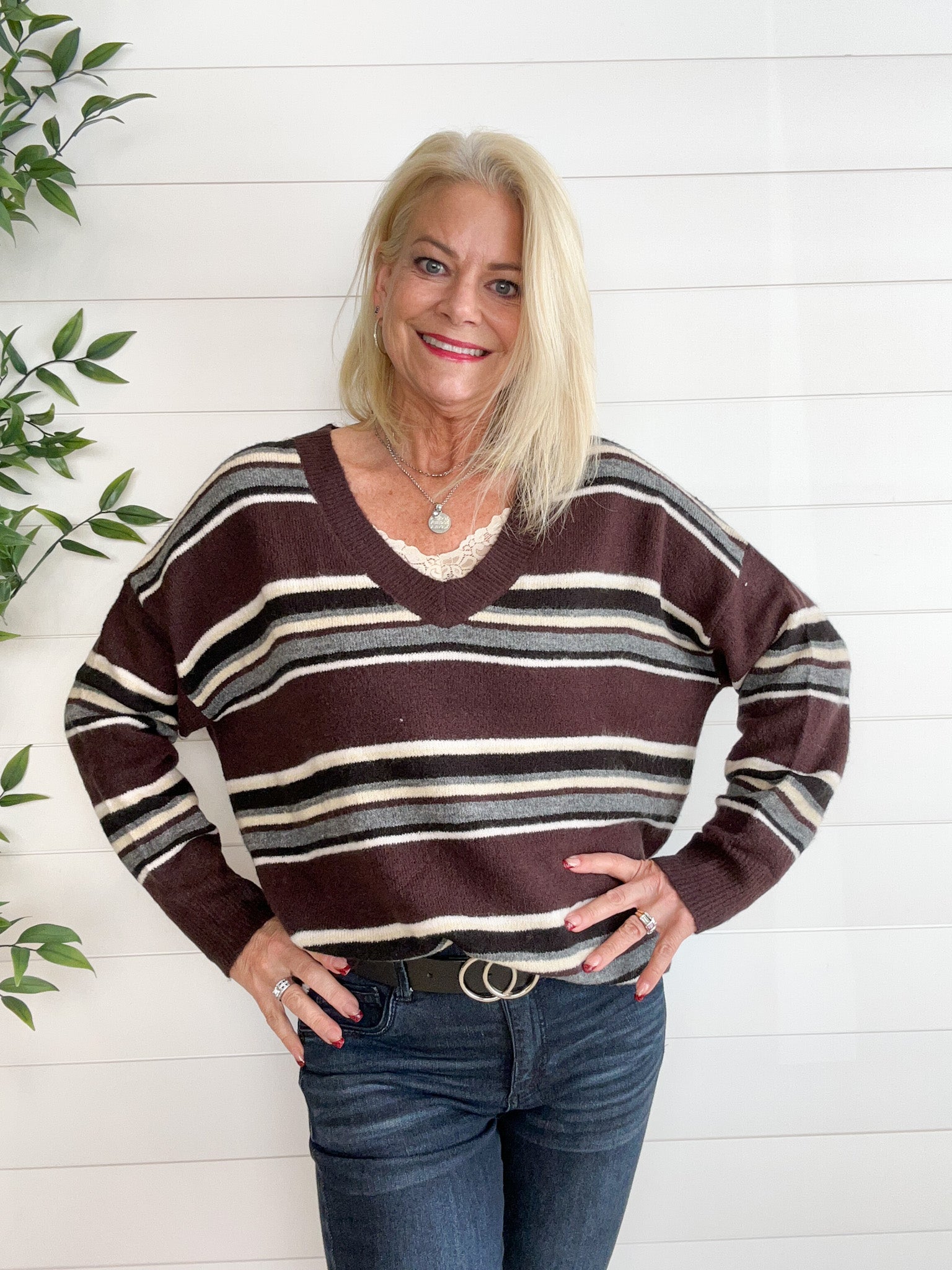 Add a touch of classic style to your wardrobe with this Multicolor Stripe V-Neck Sweater! Crafted from a cozy blend of 77% acrylic, 20% nylon, and 3% spandex, it’s soft, stretchy, and ready for whatever the day throws at you. The classic stripes and flattering V-neck bring a sporty vibe, perfect for layering or wearing solo. Brighten up chilly days with great style and comfy warmth all in one!