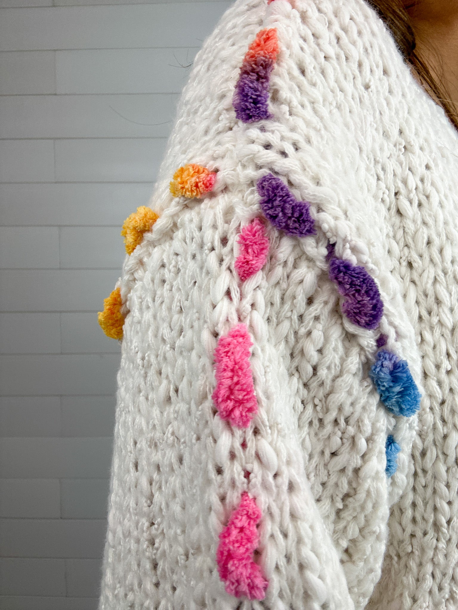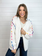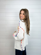 This cardi is all about cozy vibes with a cheerful twist! The solid, plush body feels oh-so-soft, while rainbow chenille stitching along the hems adds the happiest little pop of color. With its flyaway, open-front style and waist-length cut, it’s the perfect throw-on-and-go piece for everyday layering.