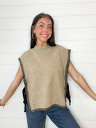 The Faux Blanket Stitch Side Tie Sweater brings cozy vibes with a handcrafted touch. Designed with a poncho-inspired silhouette, this sweater features a soft mock neckline and easy, relaxed drape. Side ties add a playful twist, while the contrast jacquard detail mimics blanket stitching for that homespun, artisanal look. Lightweight yet warm, it’s the perfect layer to toss on when you want comfort with a side of style.