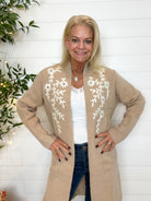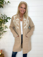 Wrap yourself in whimsy with our Floral Embellished Coatigan — a dreamy blend of cozy knit and delicate detailing. This flyaway-style duster cardigan features soft eyelash embroidery that brings each flower to life, with sparkling sequins at their centers for just the right touch of shimmer. The longline silhouette and handy pockets make it as practical as it is pretty — a true statement layer for sweater season!