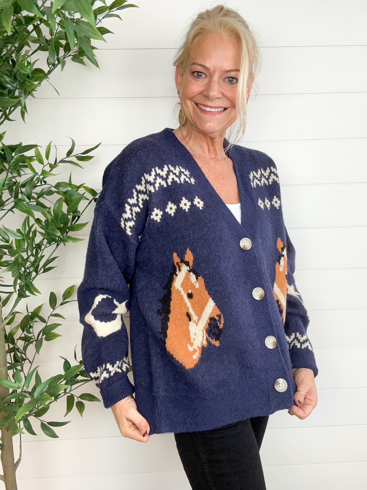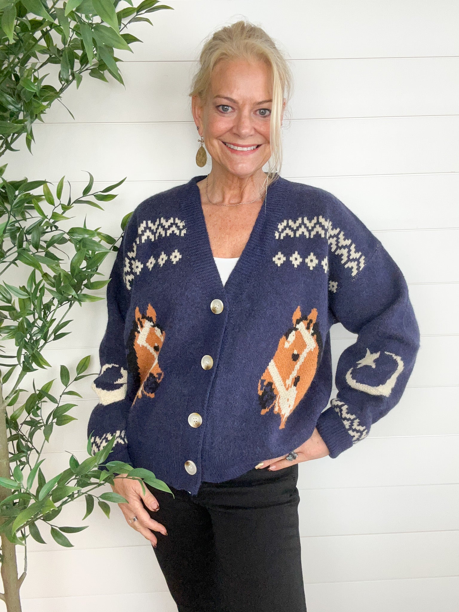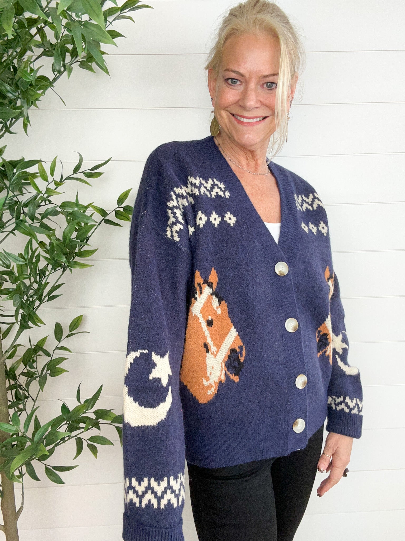 Channel cozy nights under the stars with this oversized cardigan featuring a bold horse head intarsia design. Accented with moons, stars, and horseshoes, it blends western charm with effortless style. The relaxed fit and statement buttons make it a go-to for layering with ease.