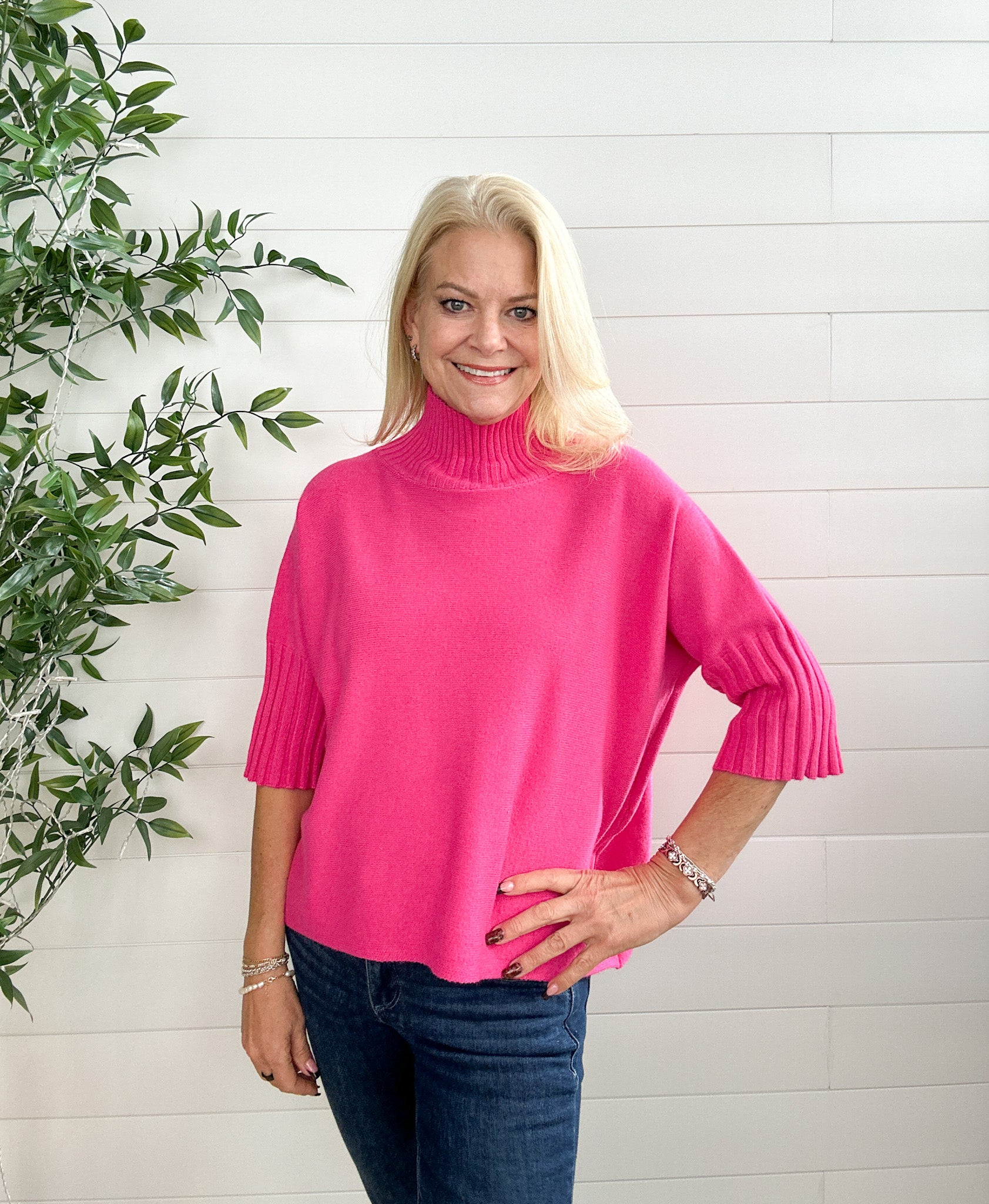 Our Made in Italy Rib Detail Pullover is the kind of piece you reach for again and again—simple, sweet, and endlessly wearable. With its meet-and-greet length and chic half sleeves, it drapes just right while the ribbed collar and cuffs add that polished little touch we love.