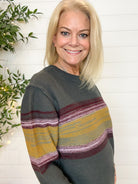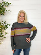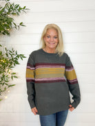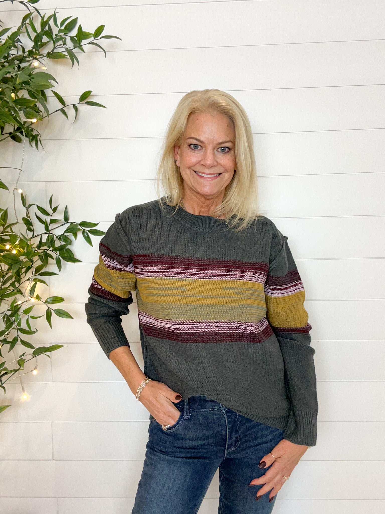Our Mixed Color Stripe Boyfriend Sweater brings a playful pop of color to your cool-weather wardrobe! With a bold multicolor stripe across the center in rich autumn and jewel tones, this soft knit feels like your favorite borrowed sweater—relaxed, cozy, and full of personality. Exposed seams and a drop shoulder add that perfectly undone, lived-in charm.