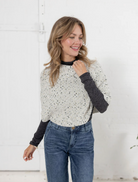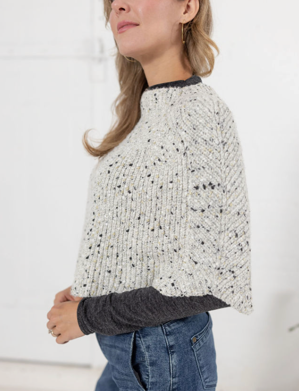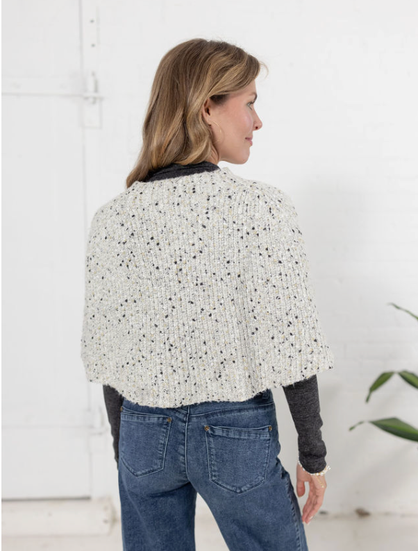 This sweater capelet is an easy way to add warmth and style to your look. It has a sleeveless design, high round neck, and a round hem, all in a soft metallic speckled yarn.