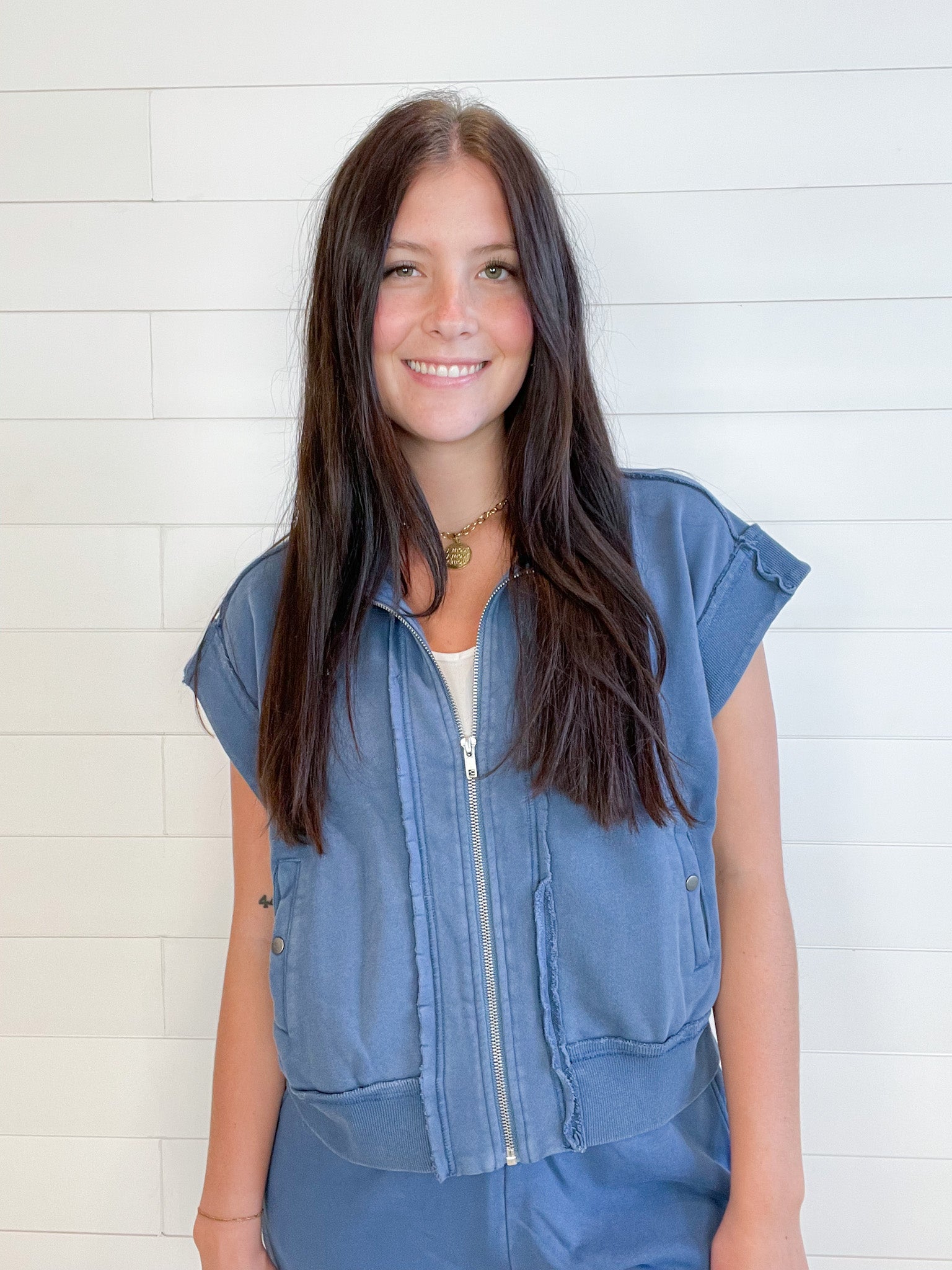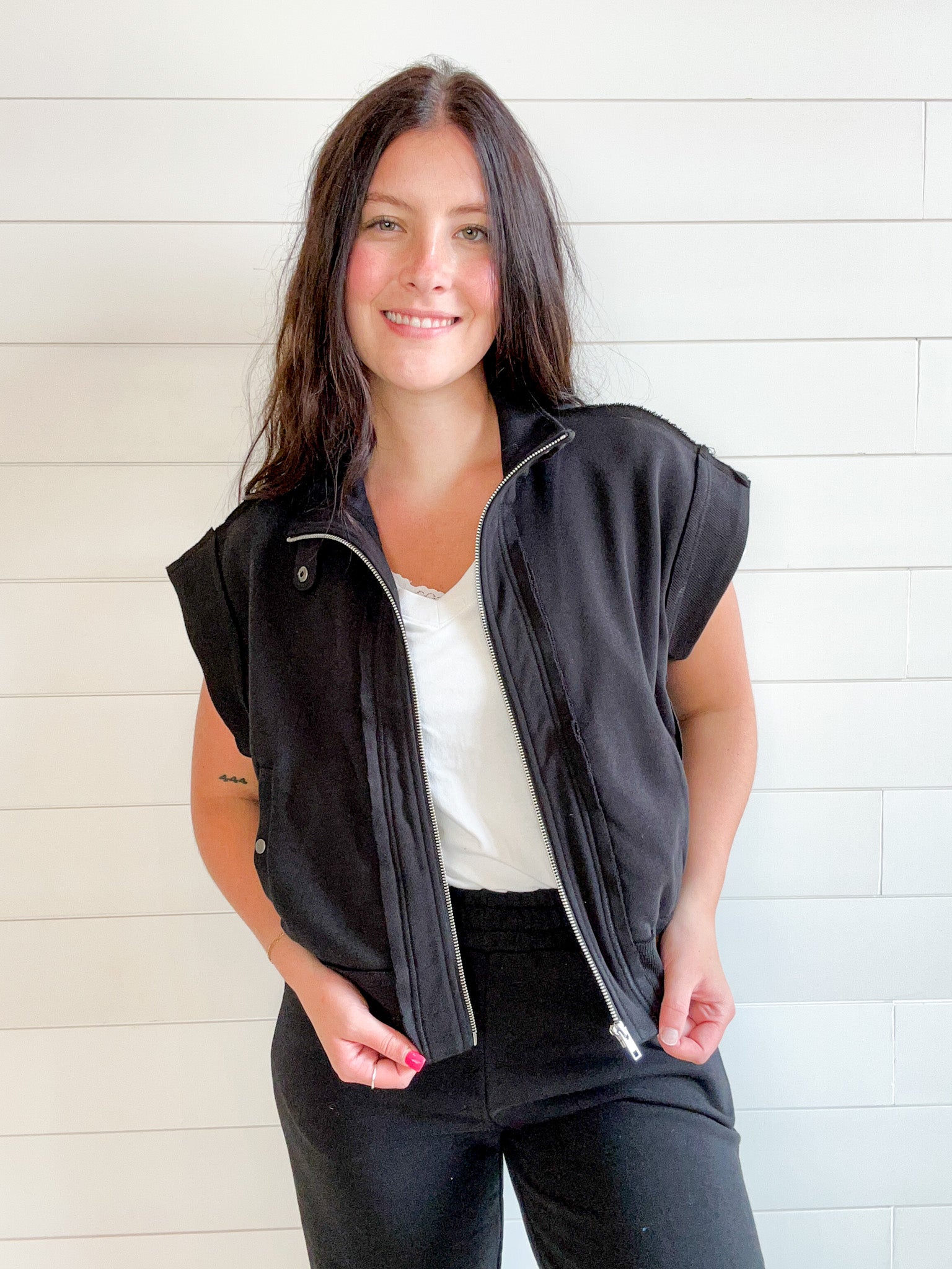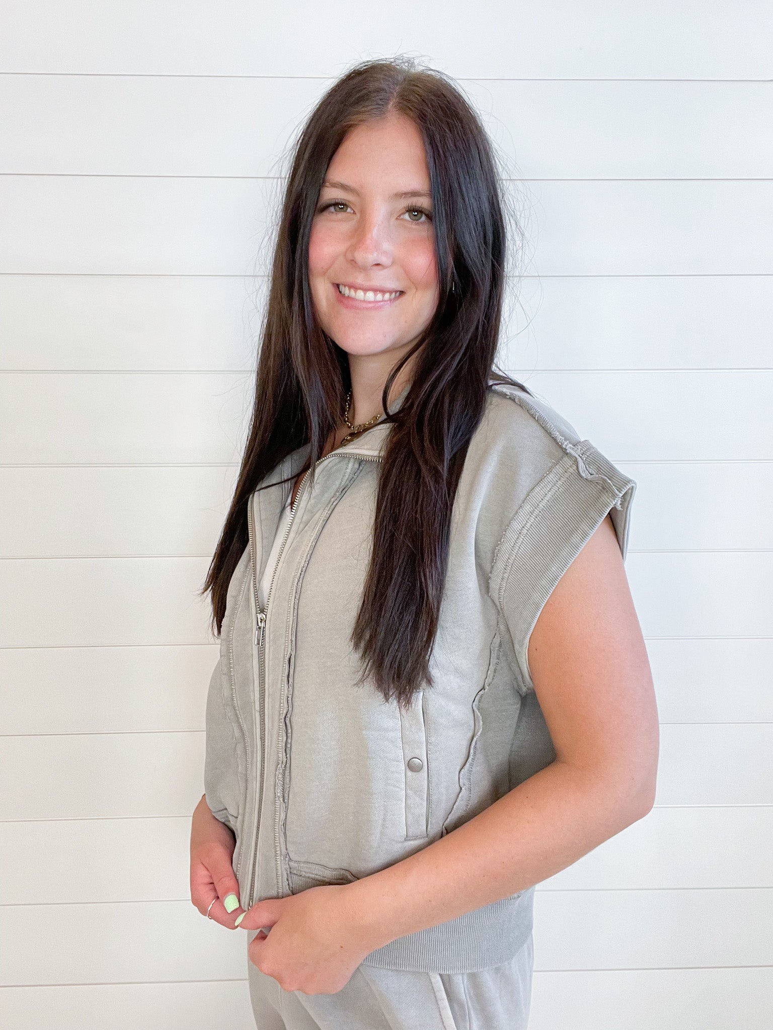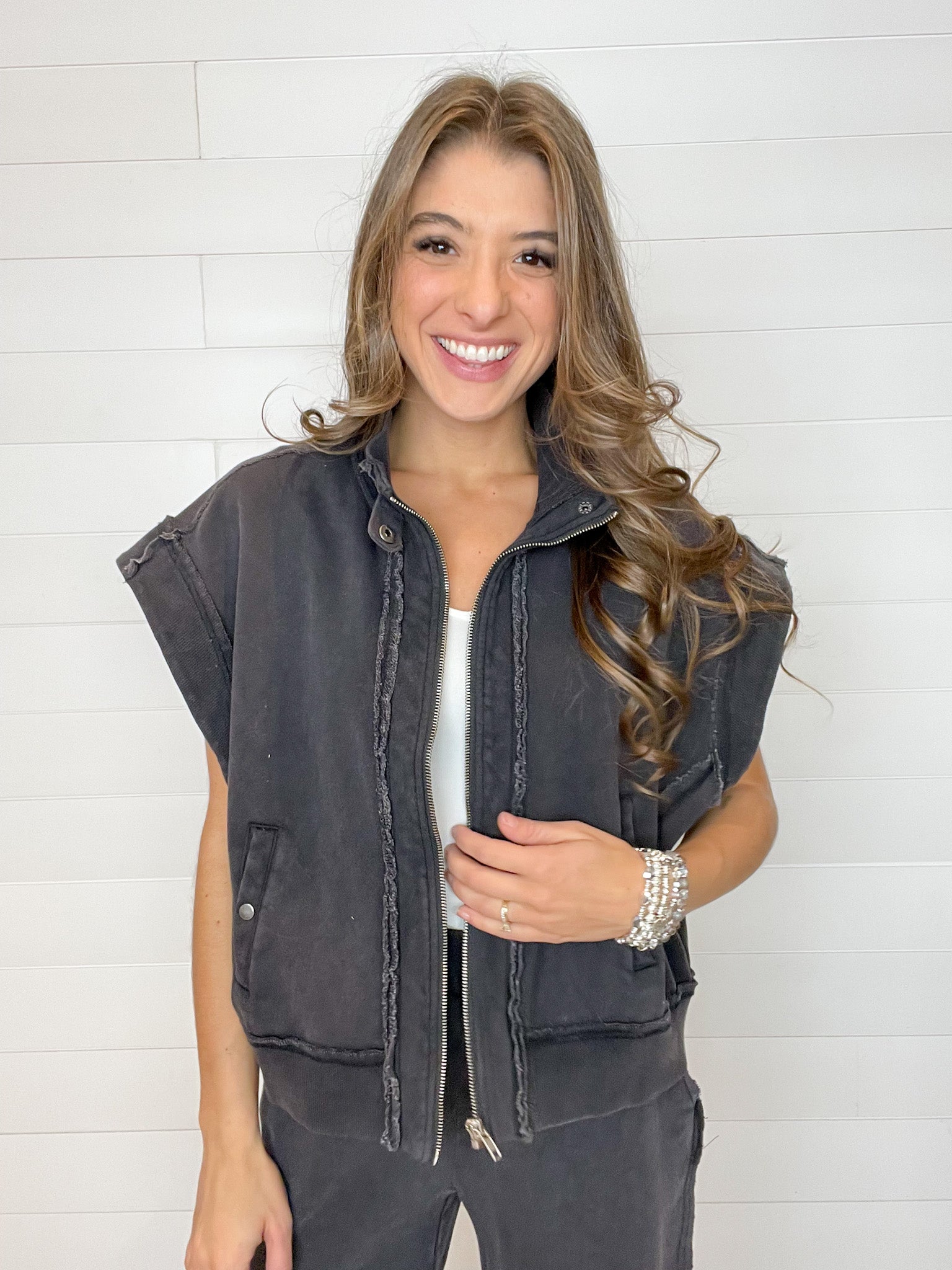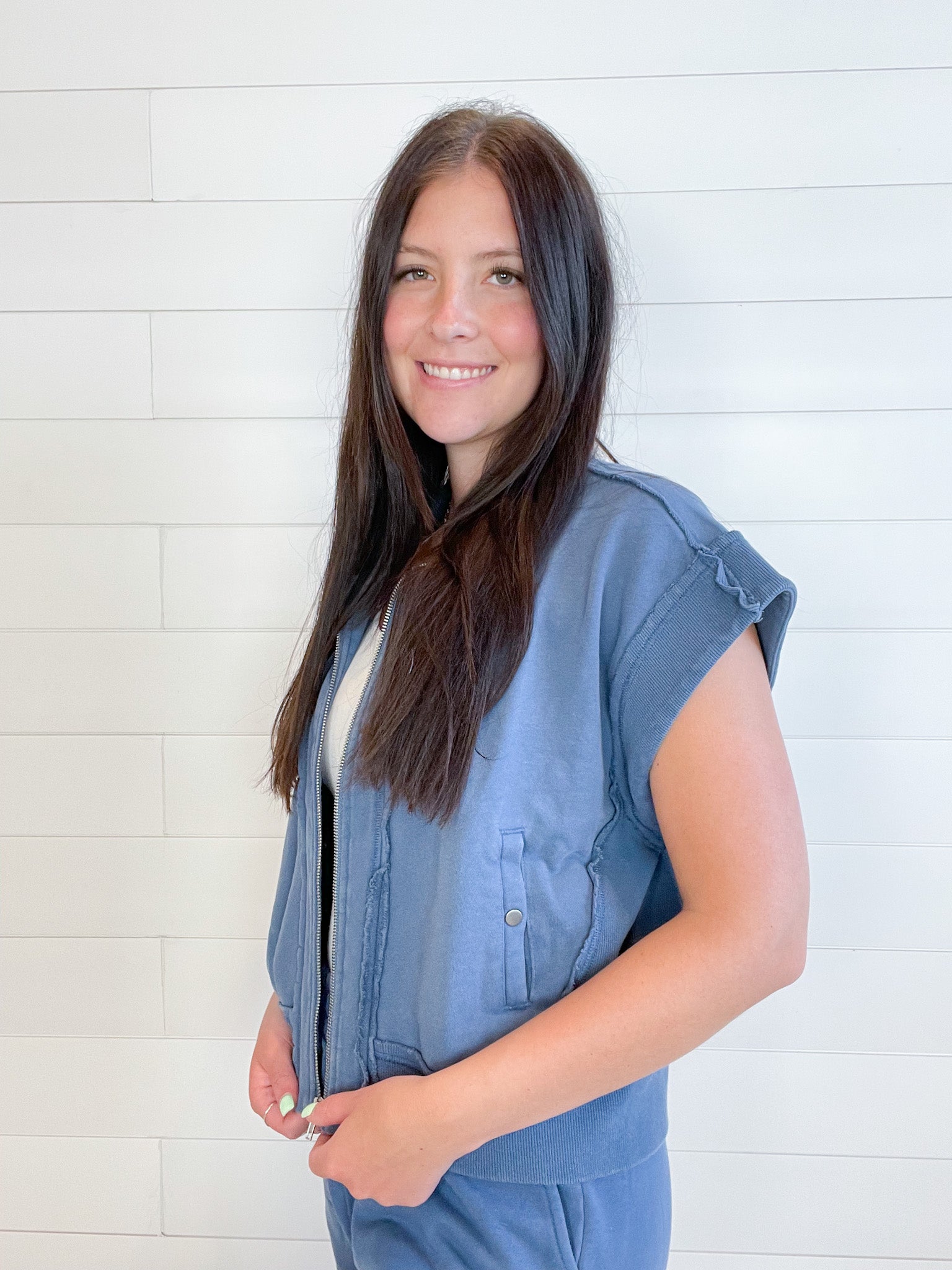 Crafted from soft french terry, this vest is all about casual charm with modern details. The exposed seams and frayed hem add just the right touch of edge, while the drop shoulder and hip-length cut make it a versatile layering piece for any season.