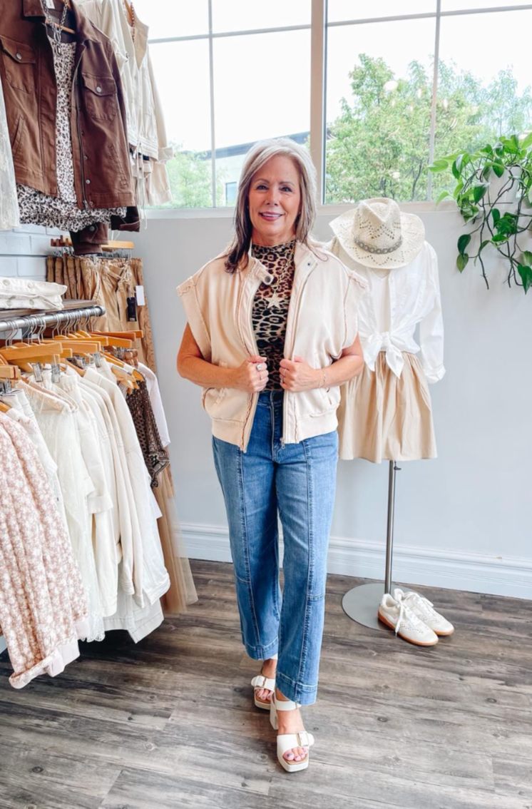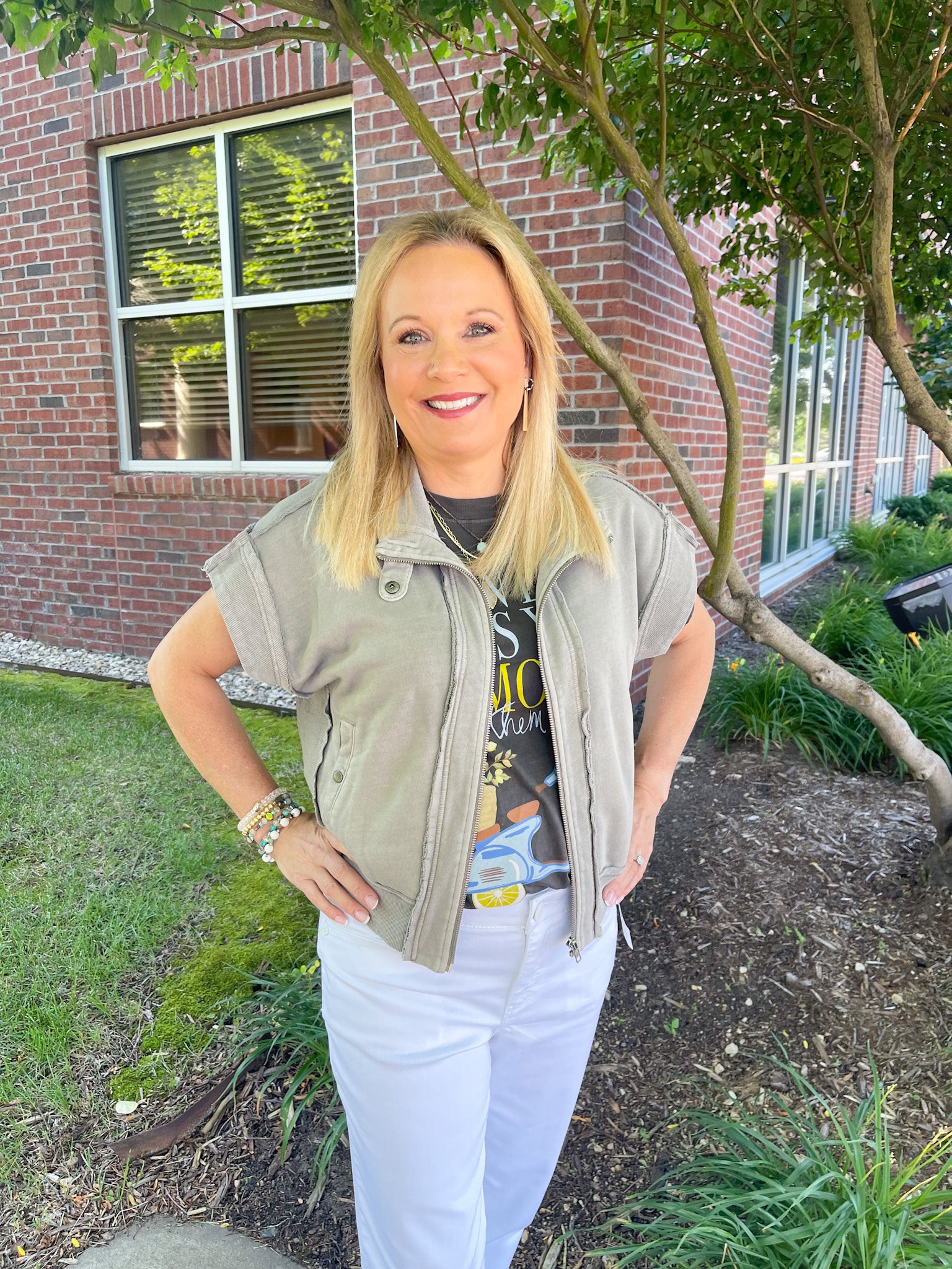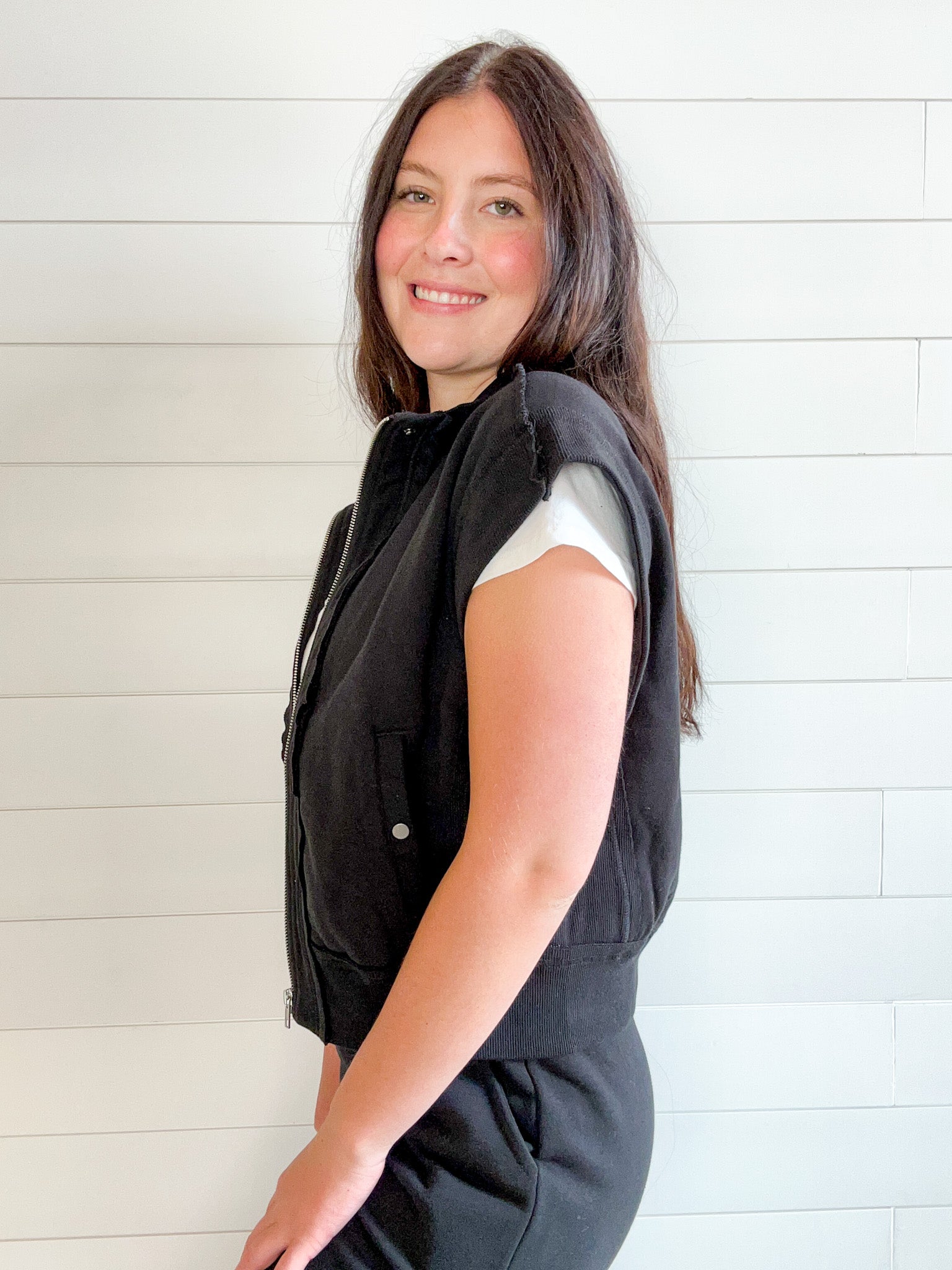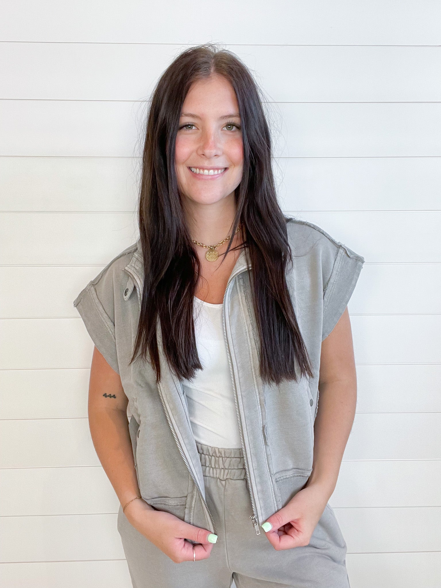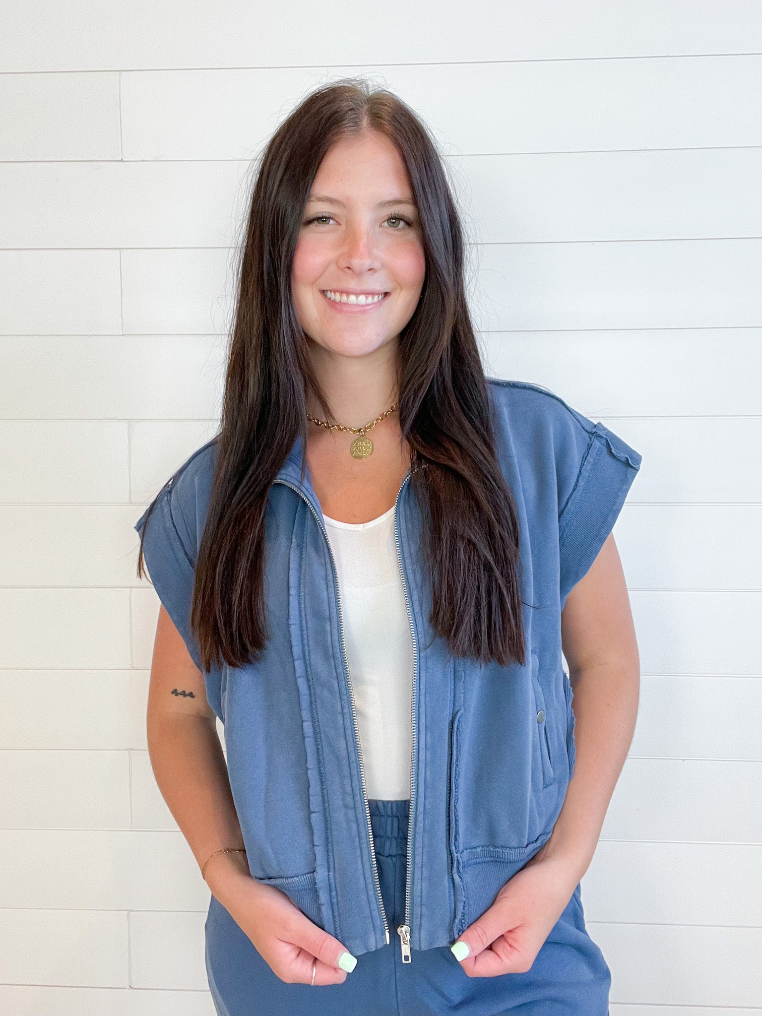 Crafted from soft french terry, this vest is all about casual charm with modern details. The exposed seams and frayed hem add just the right touch of edge, while the drop shoulder and hip-length cut make it a versatile layering piece for any season.