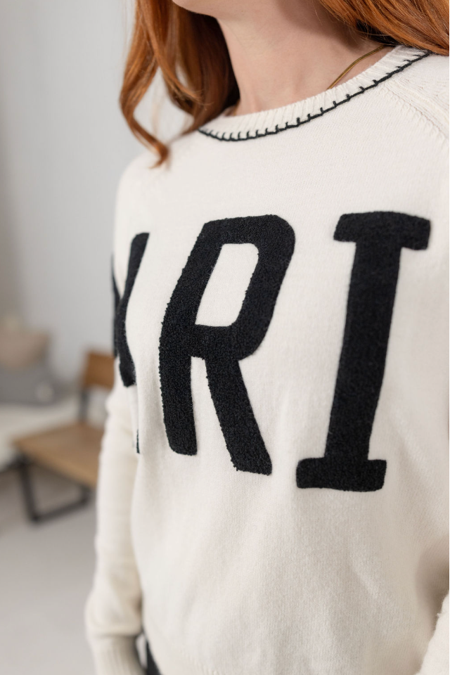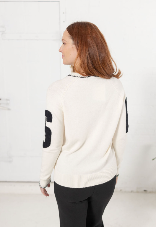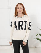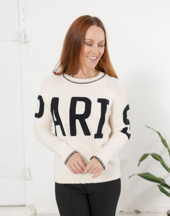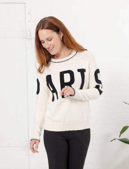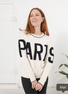 Say “oui” to cozy glamour! This sweater features soft contrast blanket stitching at the neckline and cuffs, with “Paris” spelled out in playful boucle appliqués across the chest and arms. Super soft and effortlessly stylish—perfect for city strolls or your chicest coffee runs.