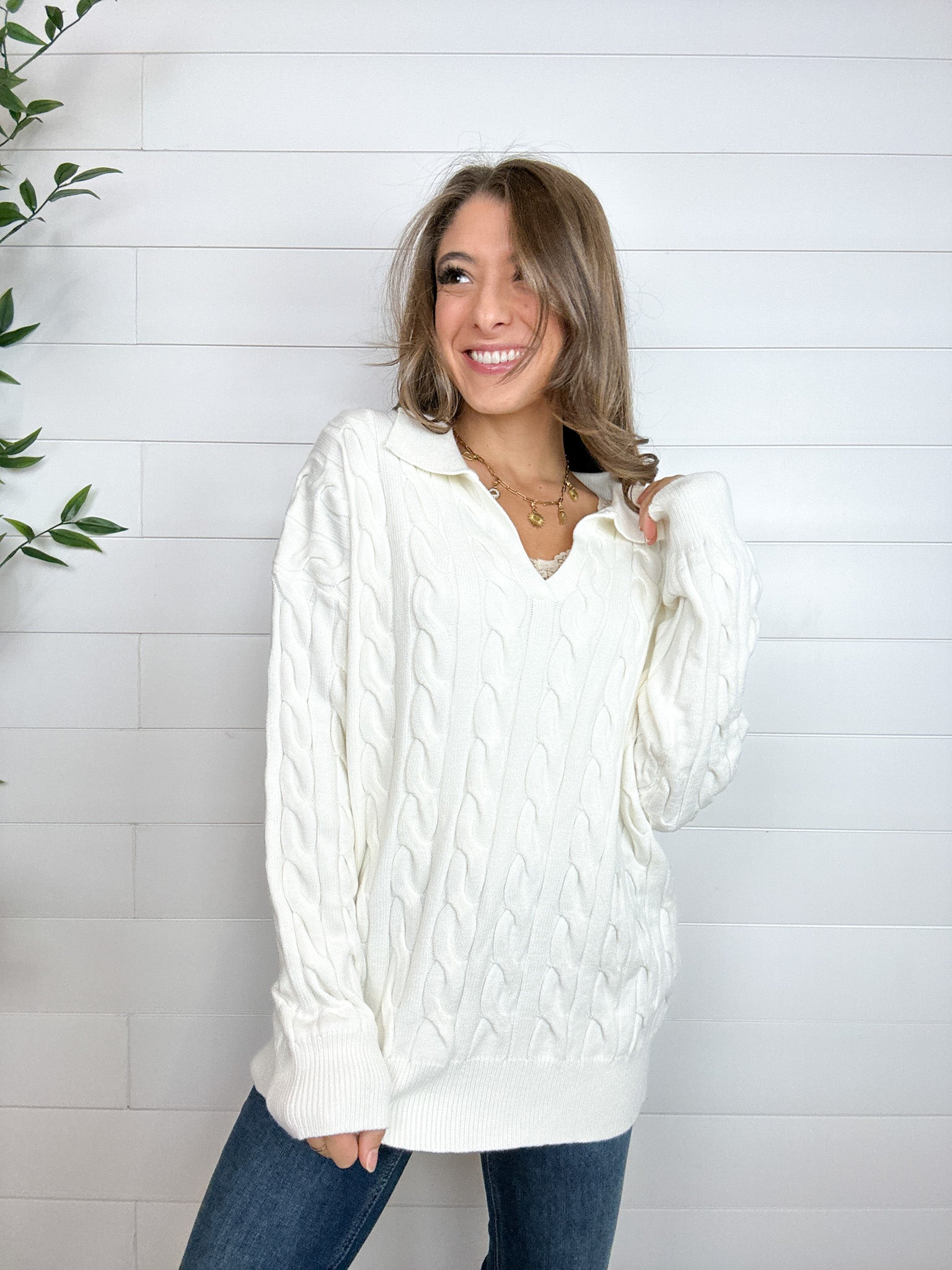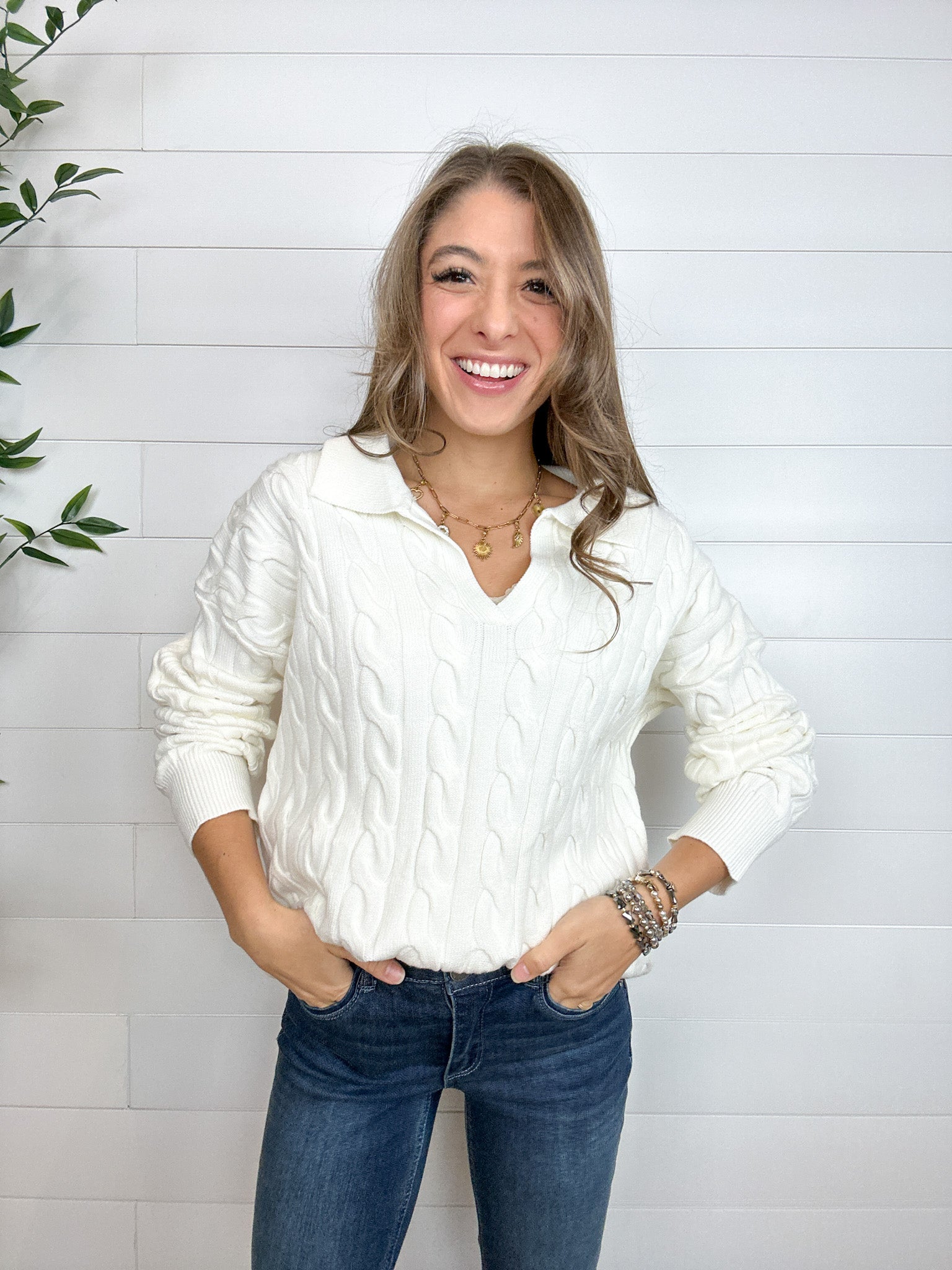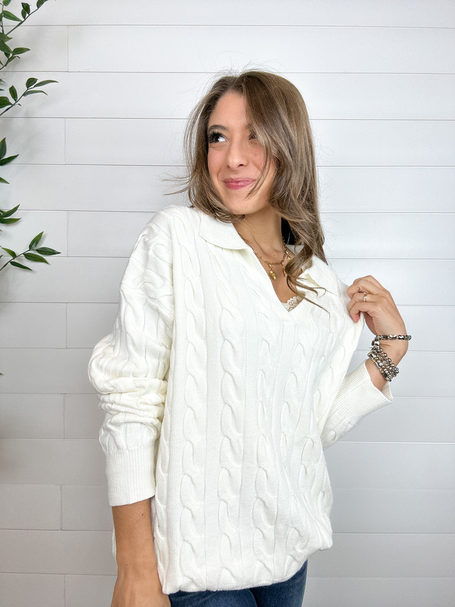 Collared V-Neck Cable Knit Sweater