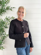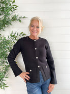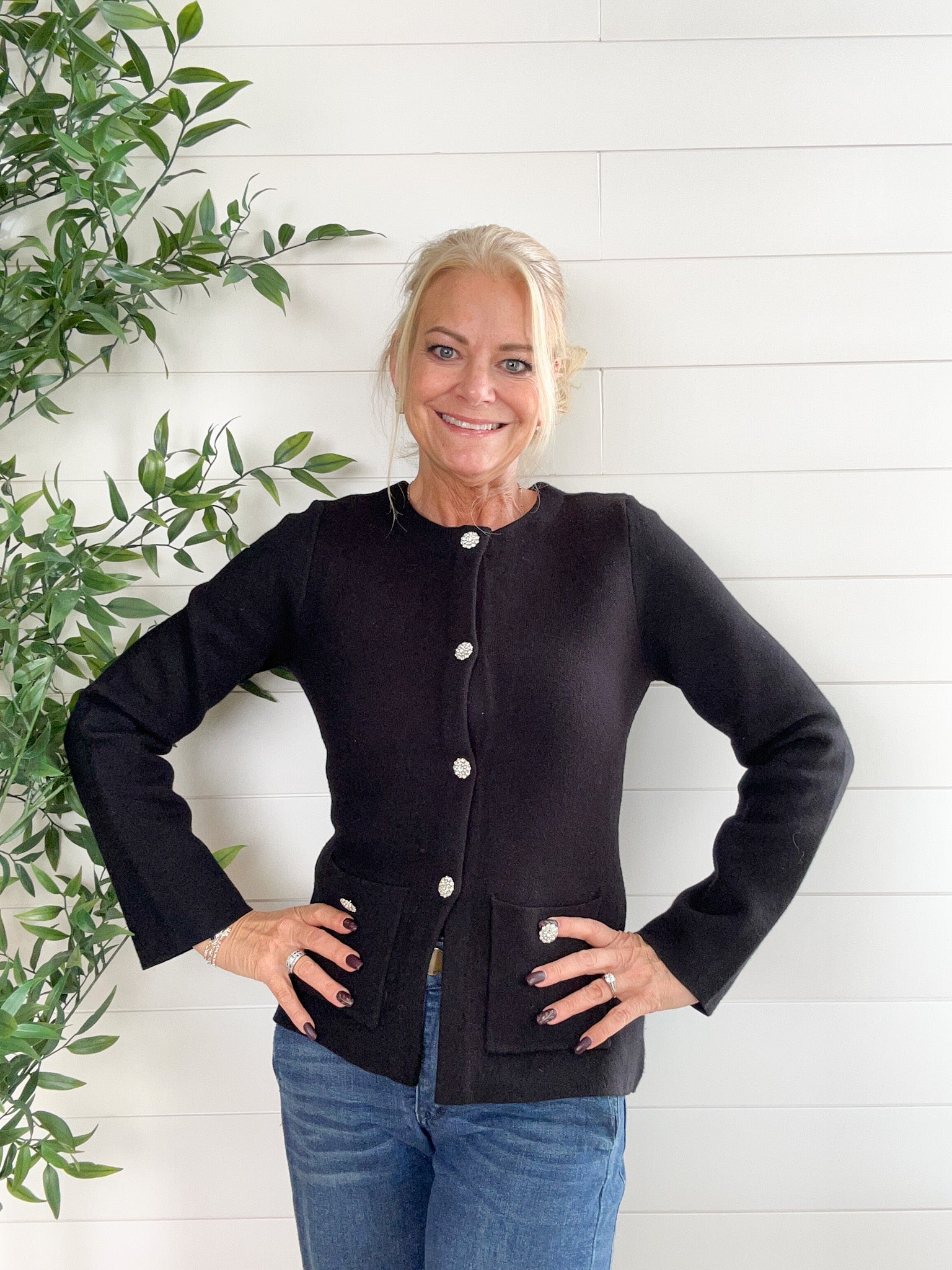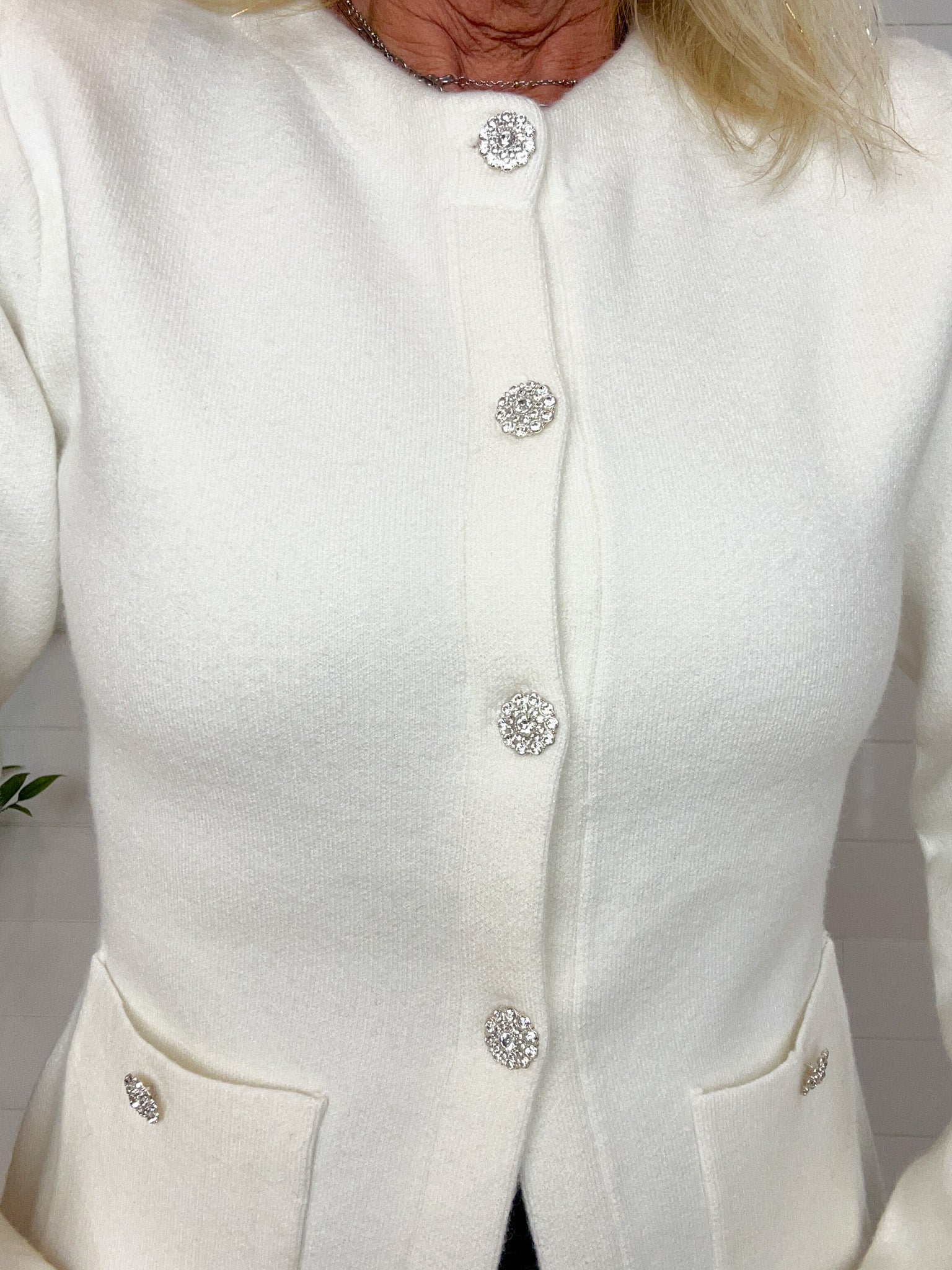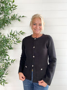 The Jewel Button Classic Cardigan channels old-money elegance with its tailored silhouette and sparkling button details. Designed to nip in slightly at the waist, it flatters your figure while keeping things refined. The soft, luxe knit and front pocket accents add a touch of understated glamour worthy of classic Hollywood.