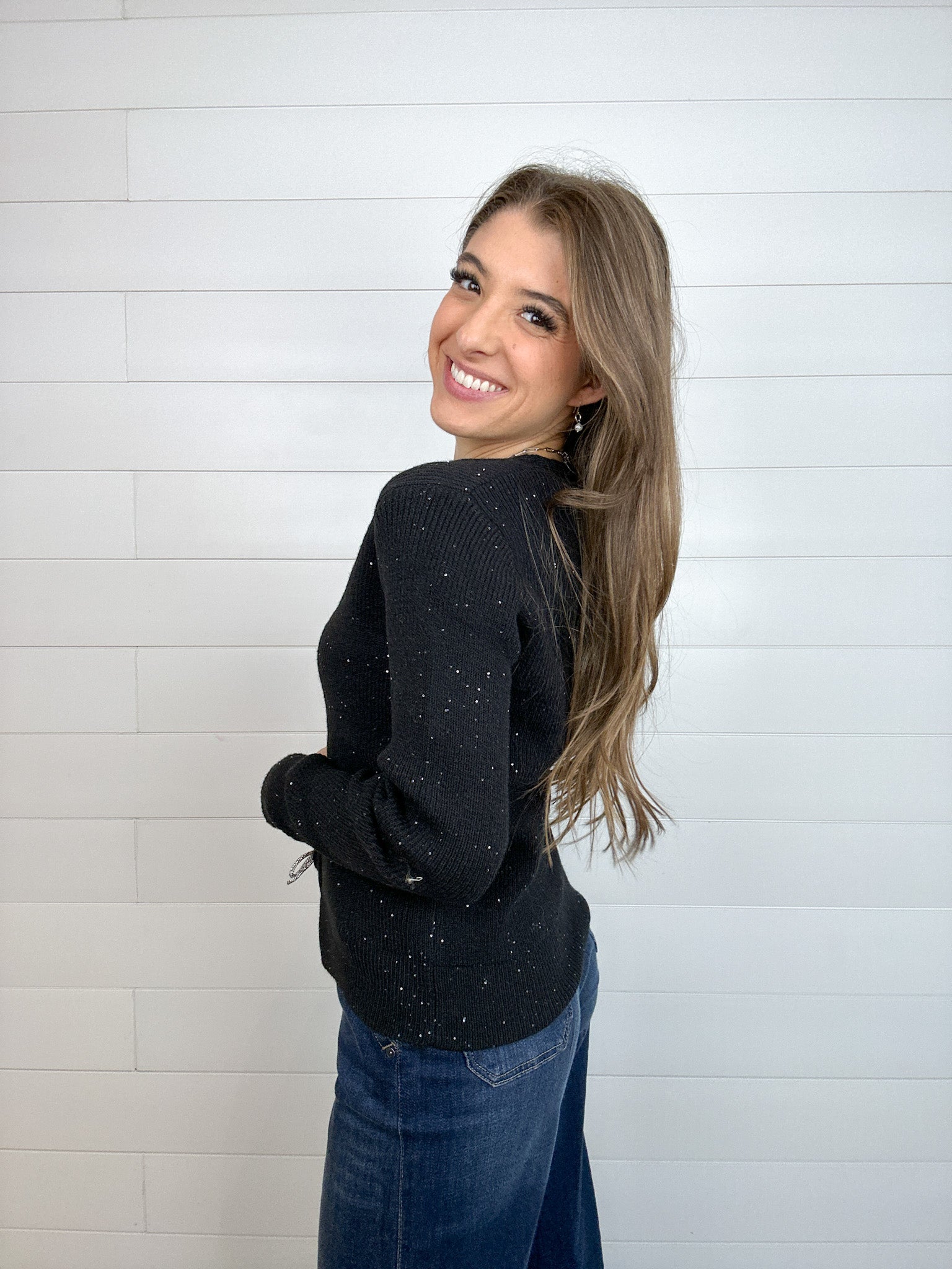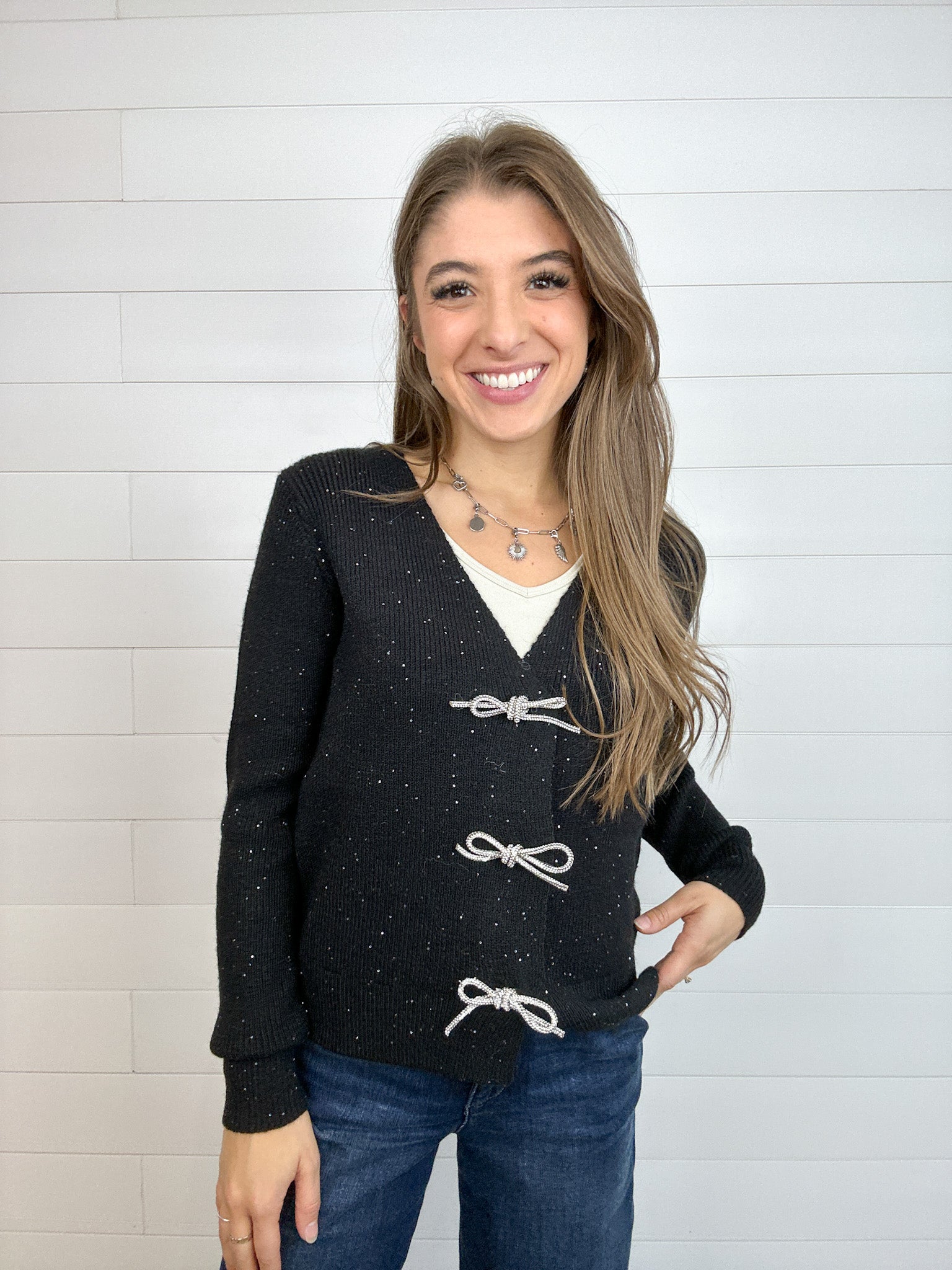 The Mira Sparkling Bow Front Cardigan is equal parts sweet and sophisticated. With its delicate knit pattern sprinkled with tiny sequins, this piece adds just the right amount of shimmer to your everyday. Three charming bow ties down the front replace traditional buttons, giving it a whimsical, feminine twist. The flattering V-neckline makes it easy to layer over camisoles or dresses, while the soft knit blend ensures comfort from day to night.