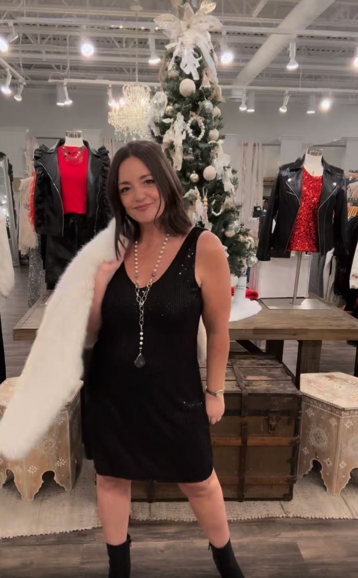 Pair it with fleece-lined leggings and tall boots for a cozy, cold-weather party look that still sparkles.
