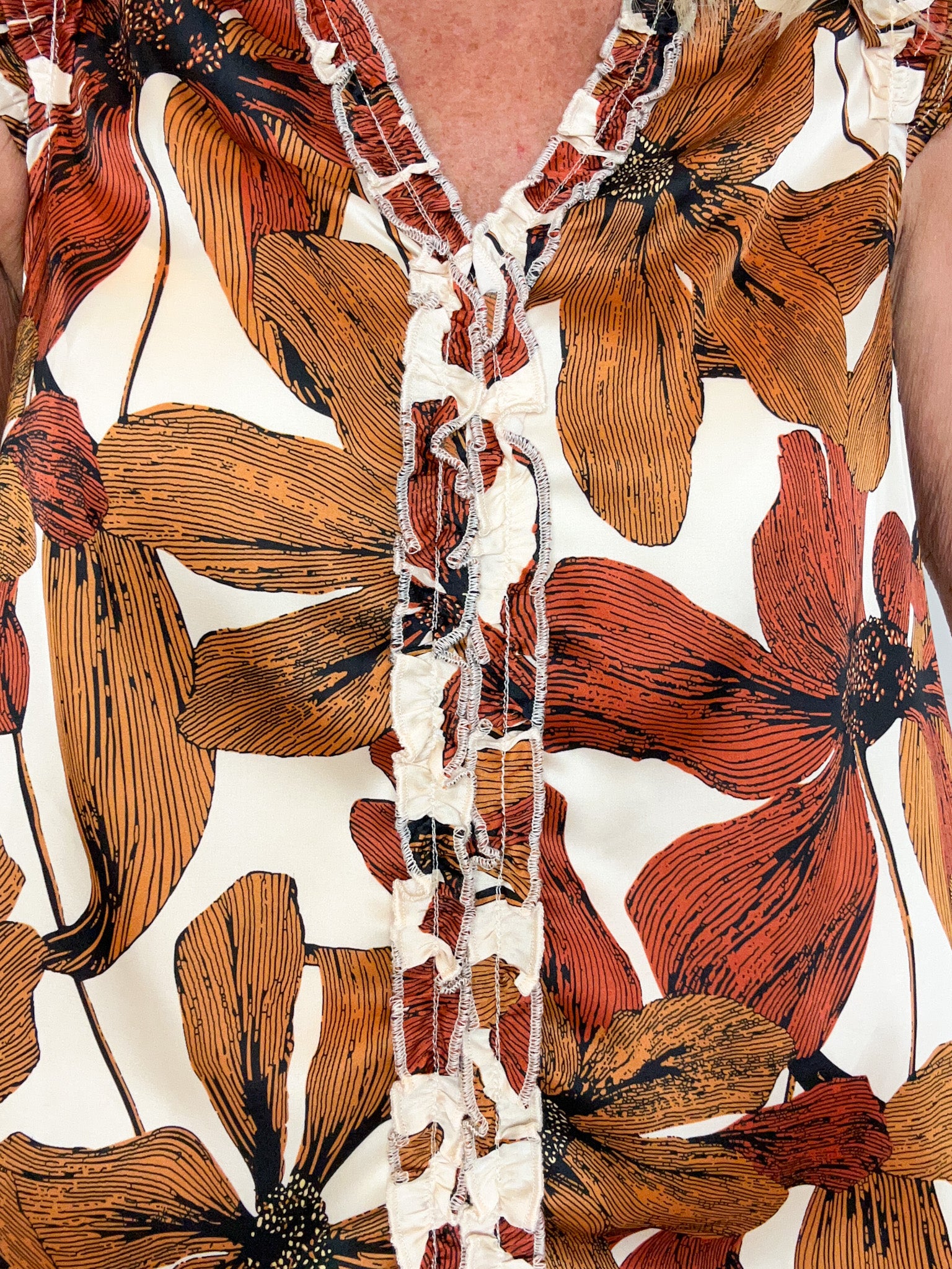 The Floral Satin Ruffle Detail Blouse brings instant charm to your wardrobe. Made from smooth, lightweight satin, it drapes beautifully while ruffled cap sleeves and a fluttery V-neckline add a touch of whimsy and femininity.