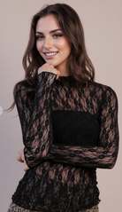 This sheer mesh lace knit top is your secret weapon for layering with style. Designed with a high mock neckline and fitted silhouette, it adds just the right touch of romance and texture without the bulk. Lightweight and versatile, it’s the perfect piece to slip under sweaters, dresses, or blazers for an elevated finish.