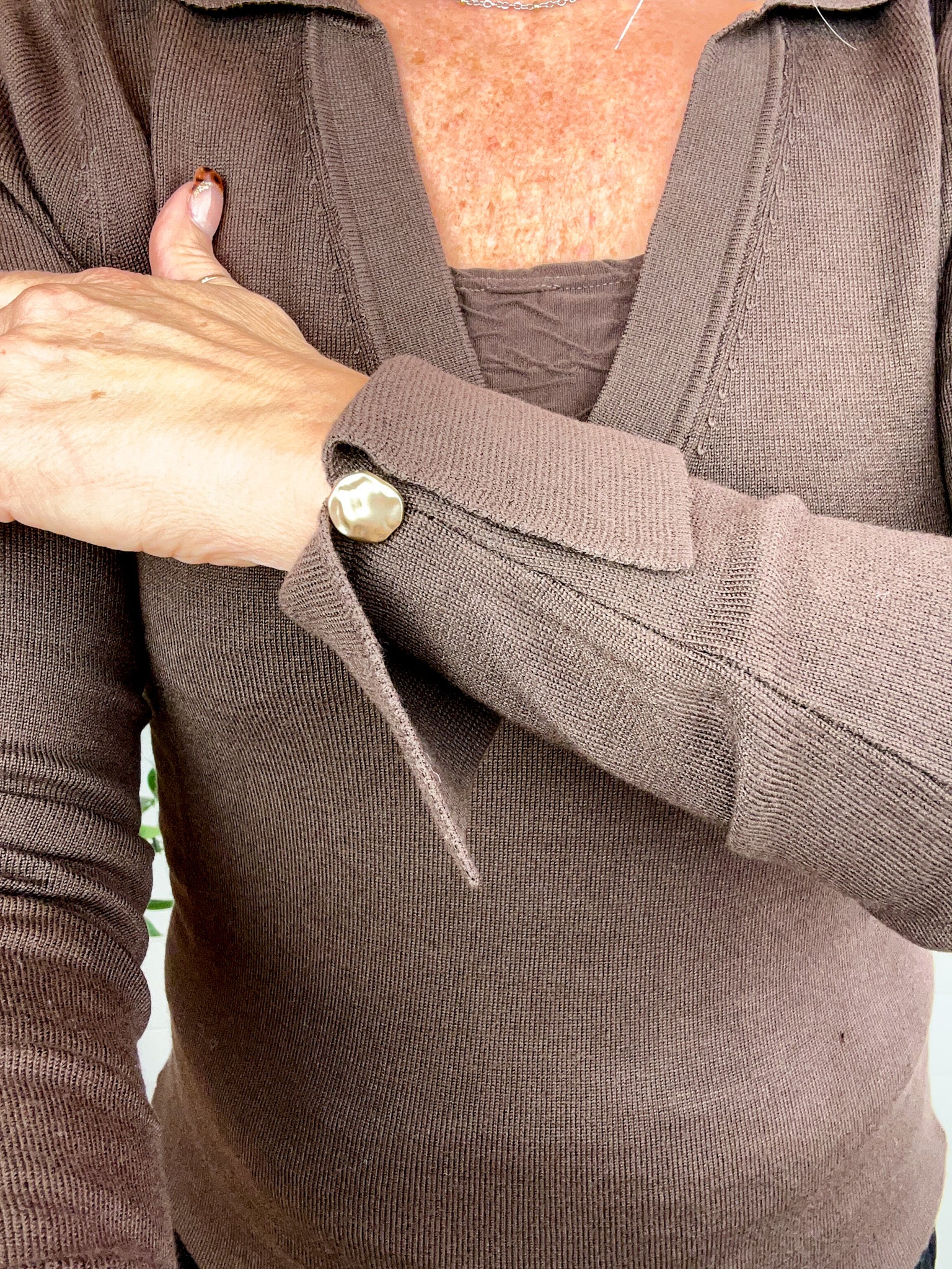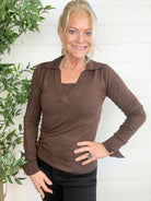 Elevate your everyday layering with this soft-knit, long sleeve top. The split polo-style collar adds a touch of refinement, while the fitted silhouette hugs just right for a flattering, sleek look. Perfect for pairing with skirts, trousers, or your favorite jeans for effortless style.