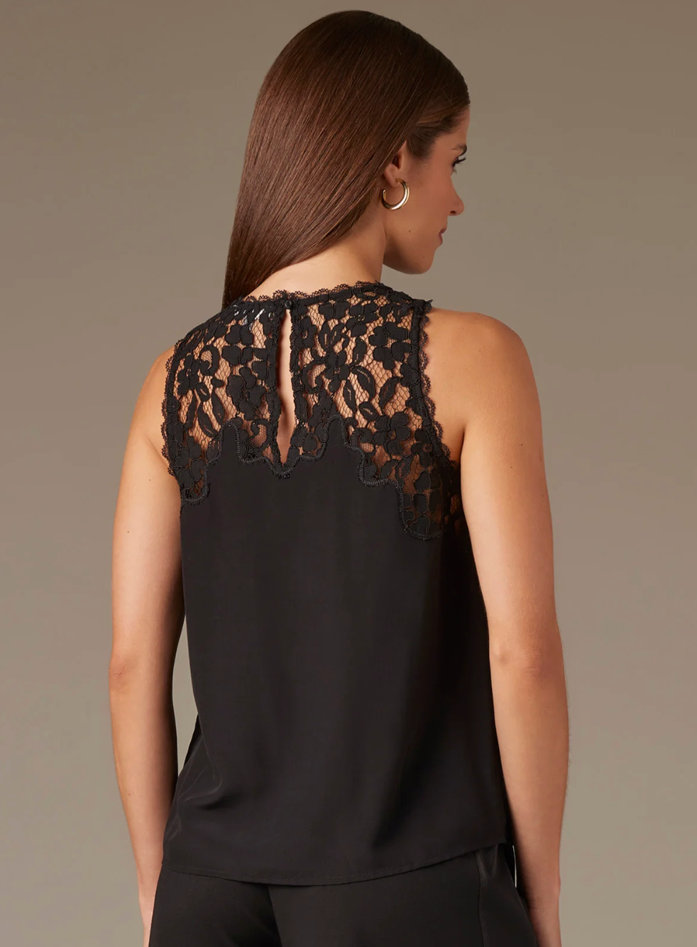 This woven tank top has a sleeveless design, round neck, lace yoke with scallop edge, and a keyhole back. The winter white colorway is slightly sheer.• Slub charmeuse