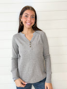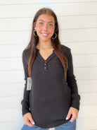 This MB Henley is all about relaxed sophistication. Crafted in soft waffle-knit fabric, it features double-layered raw edge cuffs, a scooped hem, and exposed seams along the neckline for a subtly edgy vibe. Perfect for layering or wearing solo for that casually polished look.