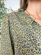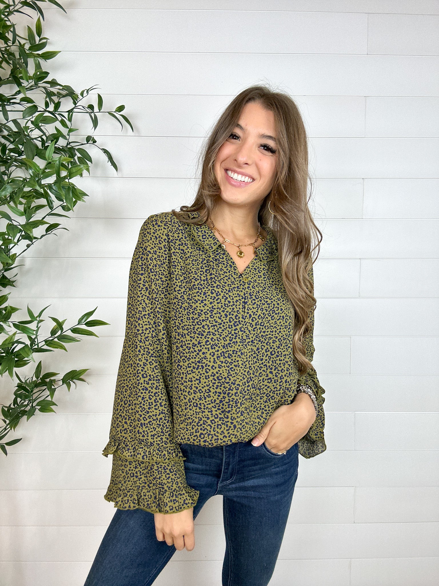 Earthy tones meet flirty details in the Micro Leopard Print Romantic Sleeve Blouse — a soft, feminine top with just the right touch of wild. The ruffle split neckline and fluttery double ruffle sleeves bring the romance, while the subtle micro leopard print adds a hint of playful edge. Perfect for dressing up denim or pairing with sleek skirts for a night out.
