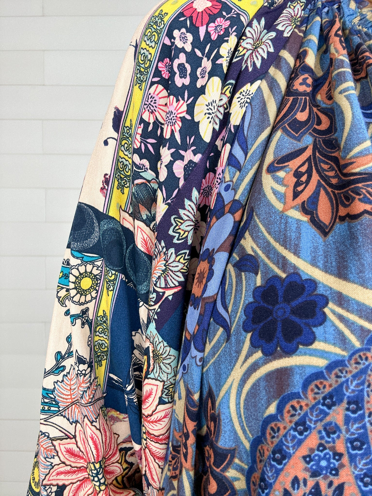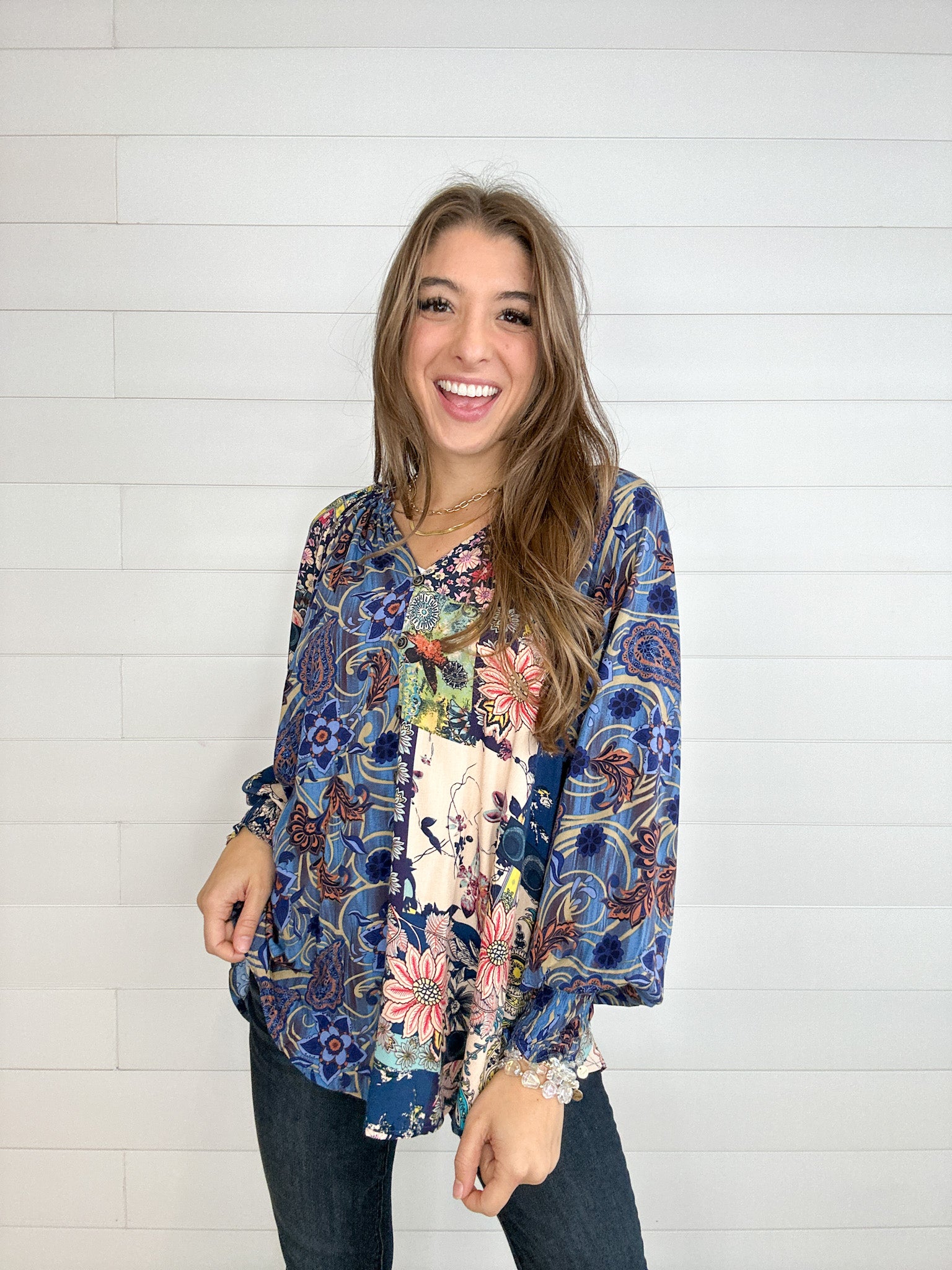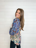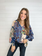 Bring effortless charm to your wardrobe with this mixed floral print split neck blouse! Lightweight and breezy, it features a playful mix of floral patterns, an oversized fit, and a tie neckline for a flirty, feminine touch. Decorative buttons run down the front for added style without fuss, making it perfect for layering or wearing solo.