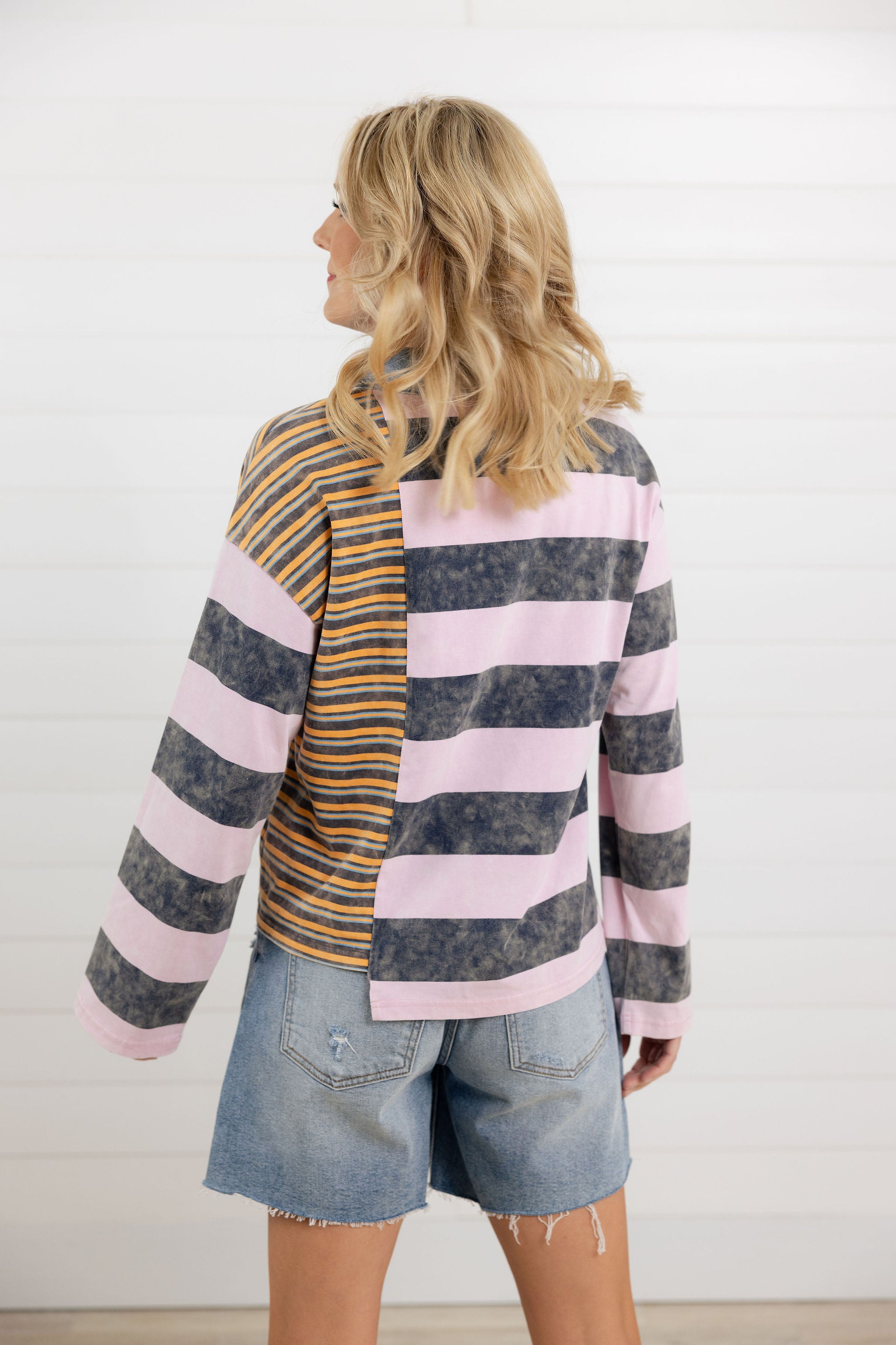 The Mix Stripe Washed Polo Shirt puts a playful, modern spin on a timeless favorite. Designed with mixed stripe patterns—including a contrasting striped panel on one side—this top feels effortlessly cool and totally unique. The denim collar and ¼ button placket add a casual-chic touch, while the washed finish gives it that soft, lived-in feel we all love. Finished with long sleeves, a loose fit, and a subtle cut-out hem, it’s relaxed, flattering, and anything but basic.
