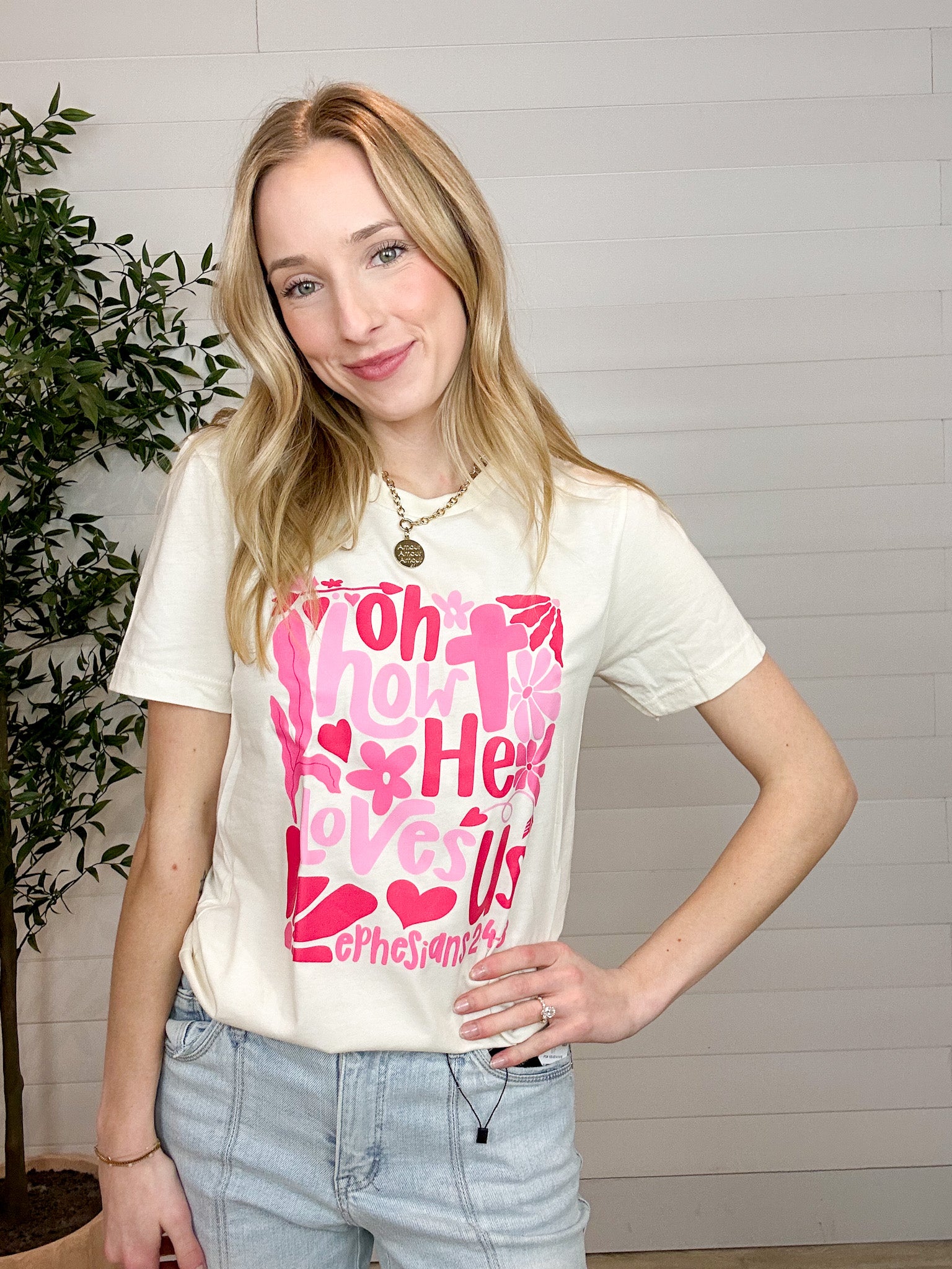 The “Oh He Loves Us” T-Shirt is a beautiful expression of faith and encouragement. Featuring the heartfelt message “Oh how He loves us, Ephesians 2:4-8” alongside florals, hearts, and a cross, this tee blends meaningful scripture with soft, feminine design. Printed on a classic Gildan 50/50 blend, it offers that comfortable, everyday fit you know and love. Easy to style and full of heart, it’s a piece that speaks without saying a word.