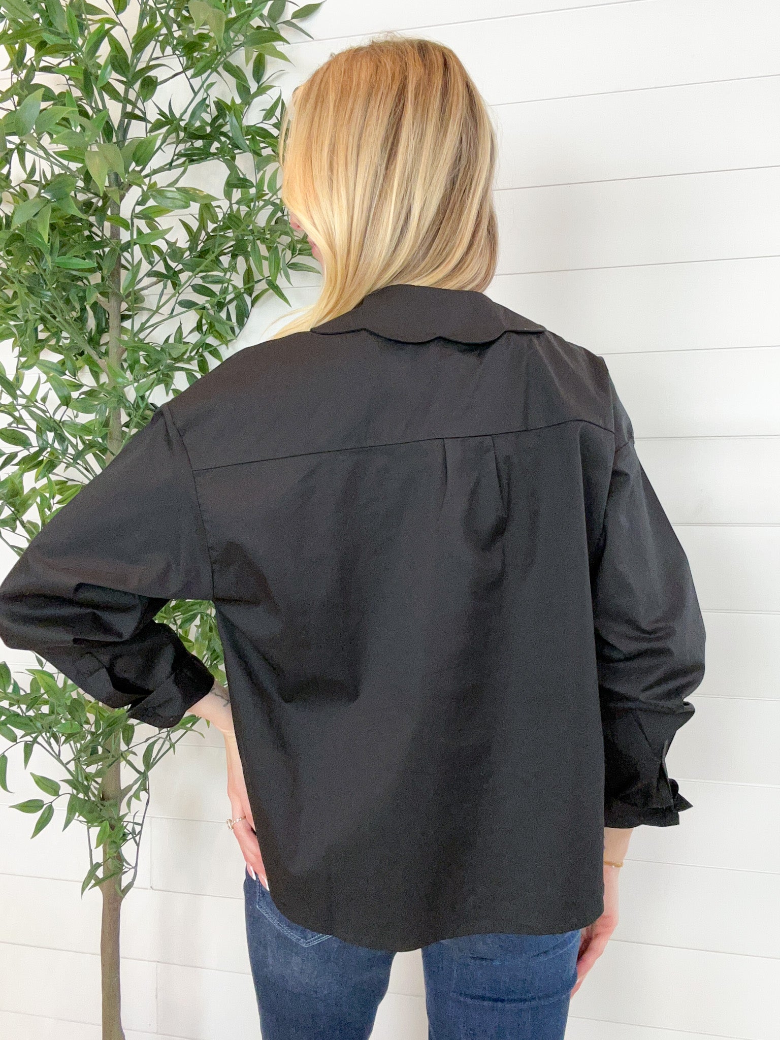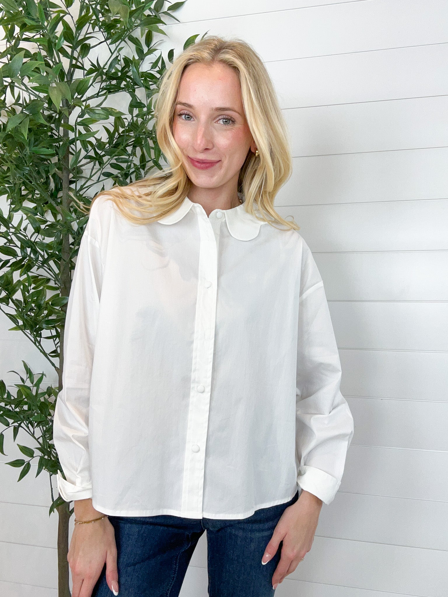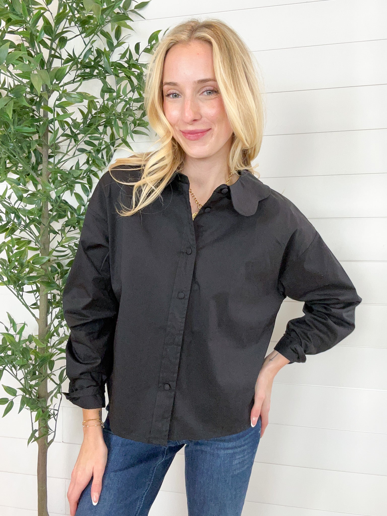 Our Scallop Collar Stretch Cotton Blouse brings timeless charm to your everyday look. With its rounded scallop Peter Pan collar and soft stretch cotton blend, this button-up is as comfortable as it is refined.