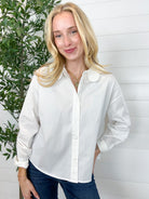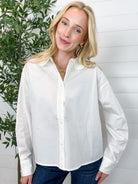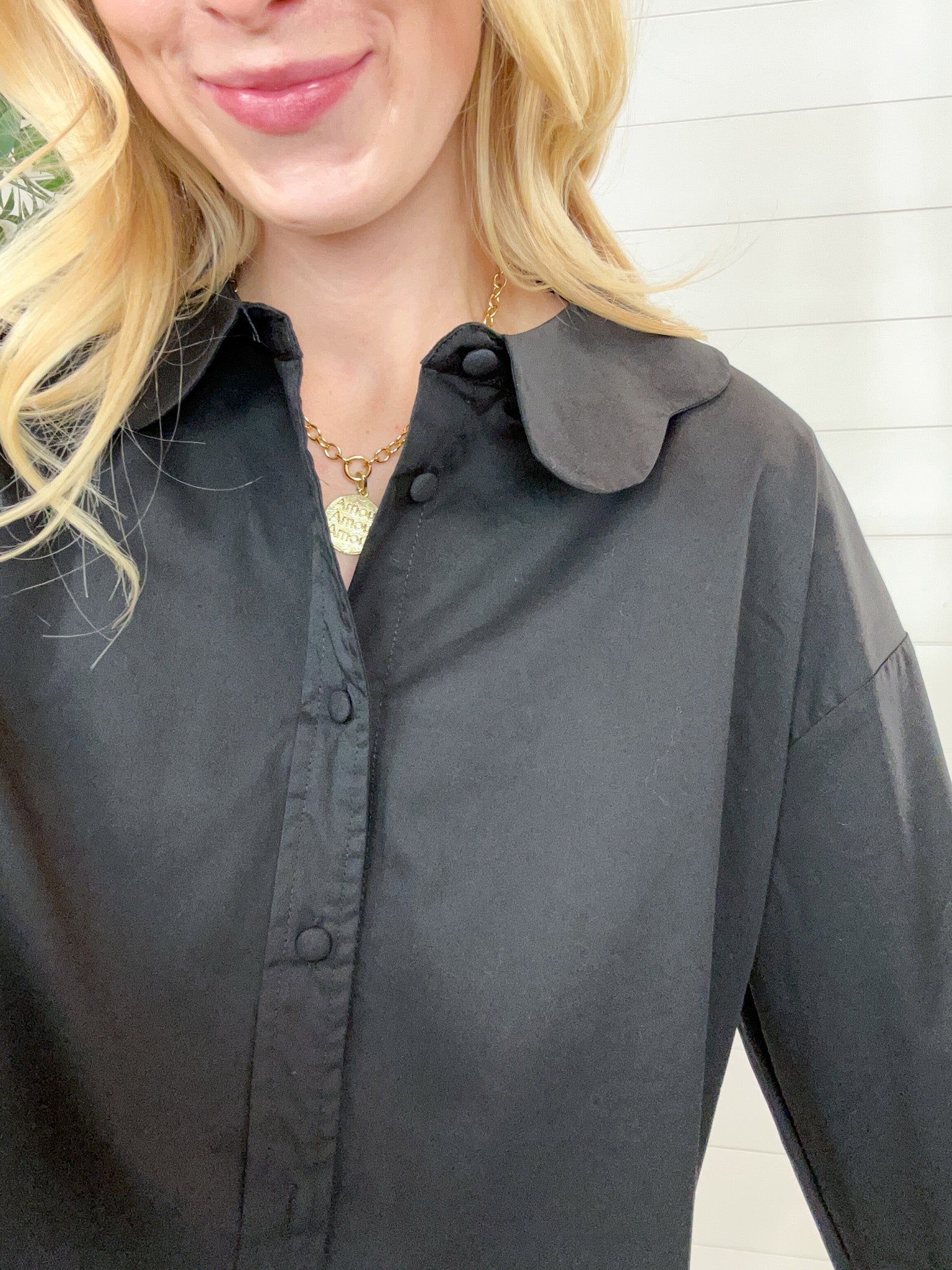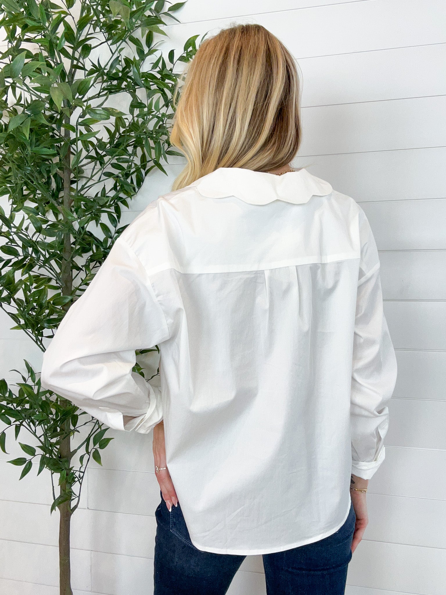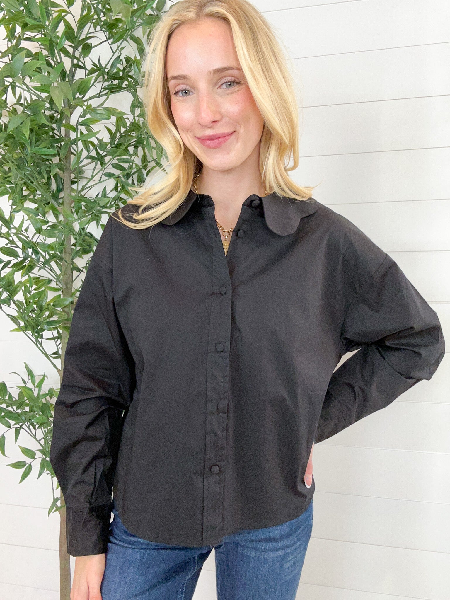 Our Scallop Collar Stretch Cotton Blouse brings timeless charm to your everyday look. With its rounded scallop Peter Pan collar and soft stretch cotton blend, this button-up is as comfortable as it is refined.